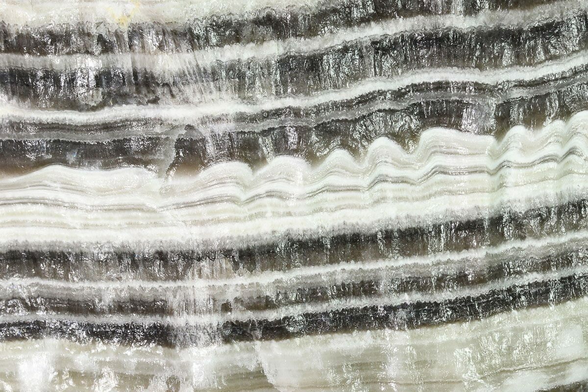 Zebra calcite, also known as "phantom calcite" or "butterfly calcite," is a striking variety of calcite characterized by bold, contrasting bands of black, white, cream, and brown. These layered patterns resemble the stripes of a zebra, giving the stone its name. Zebra calcite forms through the rhythmic precipitation of calcium carbonate in cavities or fractures within limestone or other host rocks. Over time, variations in mineral content, pressure, and temperature during the deposition process create alternating light and dark bands. The darker layers typically contain inclusions of manganese or other minerals, while the lighter bands are composed of purer calcite.