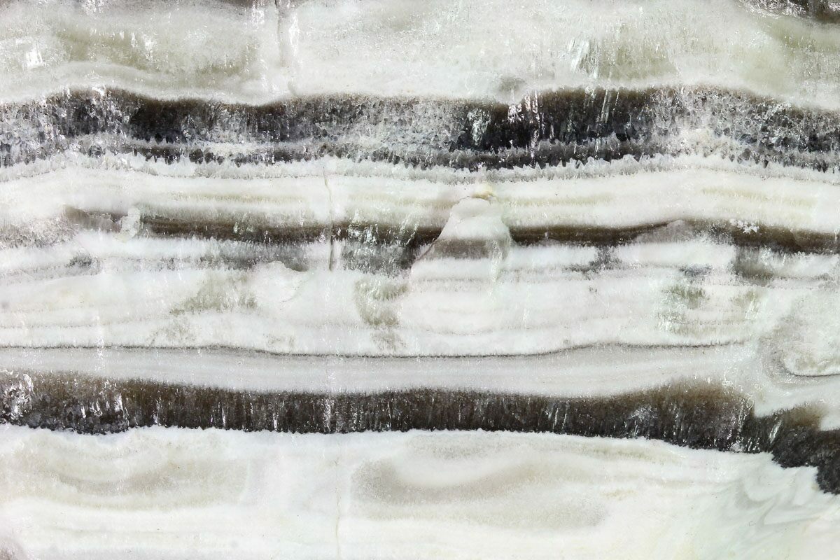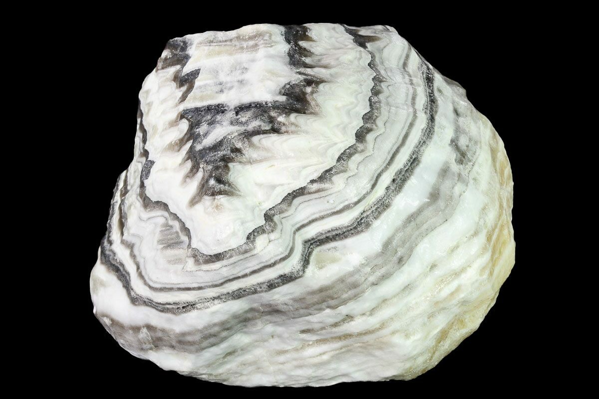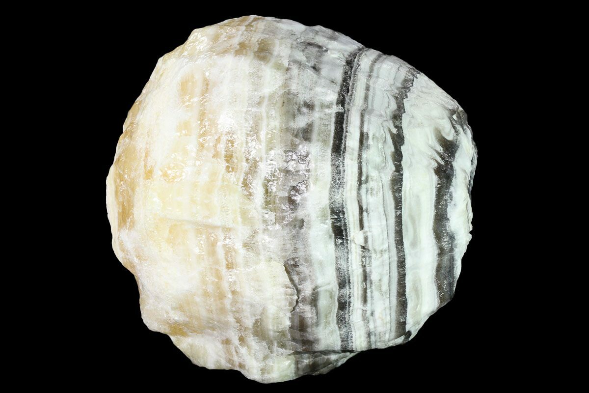 Zebra calcite, also known as "phantom calcite" or "butterfly calcite," is a striking variety of calcite characterized by bold, contrasting bands of black, white, cream, and brown. These layered patterns resemble the stripes of a zebra, giving the stone its name. Zebra calcite forms through the rhythmic precipitation of calcium carbonate in cavities or fractures within limestone or other host rocks. Over time, variations in mineral content, pressure, and temperature during the deposition process create alternating light and dark bands. The darker layers typically contain inclusions of manganese or other minerals, while the lighter bands are composed of purer calcite.