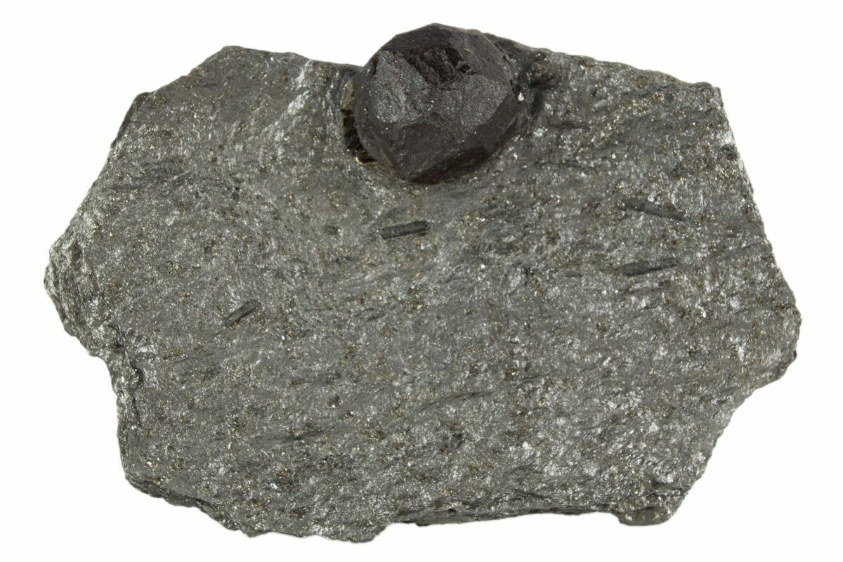 This is a .5" wide almandine garnet in a graphite matrix from the Red Embers Mine near Erving, Massachusetts. The graphite matrix has been worked to expose most of the garnet from each side. There are dravite crystals peppered throughout the graphite matrix.