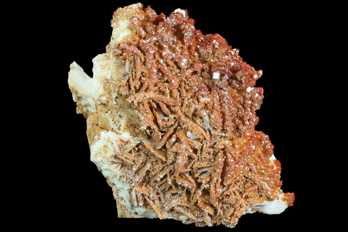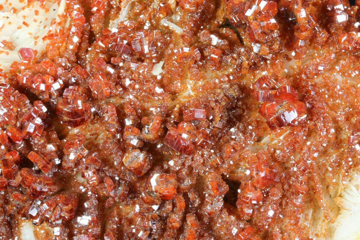 Vanadinite from Morocco is world-famous for producing some of the finest red crystal specimens on the planet. In the arid hills surrounding Mibladen and Taouz, vanadinite forms as vibrant clusters of hexagonal prisms, often with a deep crimson to orange-red color that seems to glow against the pale desert matrix. These crystals typically develop in dense groups, coating barite blades or covering weathered limestone with dazzling, glassy faces and sharp geometric symmetry. The dryness of the region and the slow oxidation of ancient lead deposits create the perfect geochemical environment for vanadinite to grow with exceptional clarity, luster, and intensity of color. Moroccan vanadinite is highly prized by collectors for its bold aesthetics, architectural crystal formations, and the consistent quality that has made these localities the global benchmark for the species.