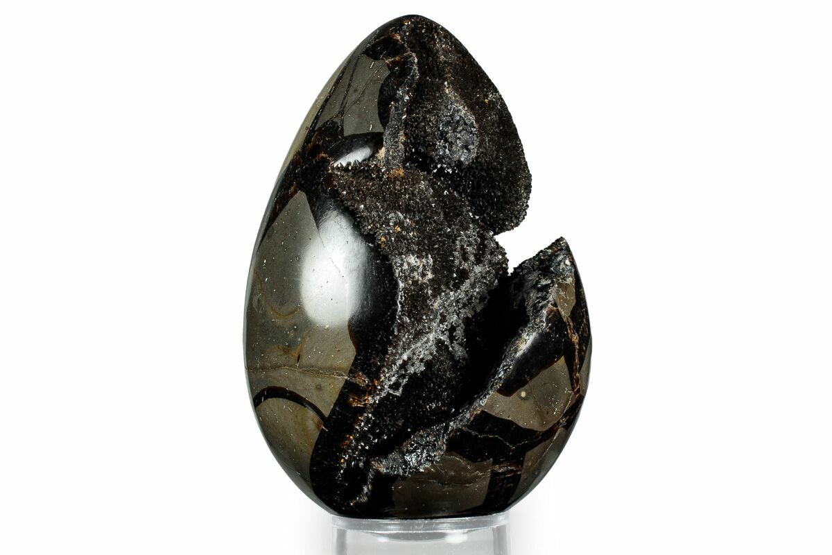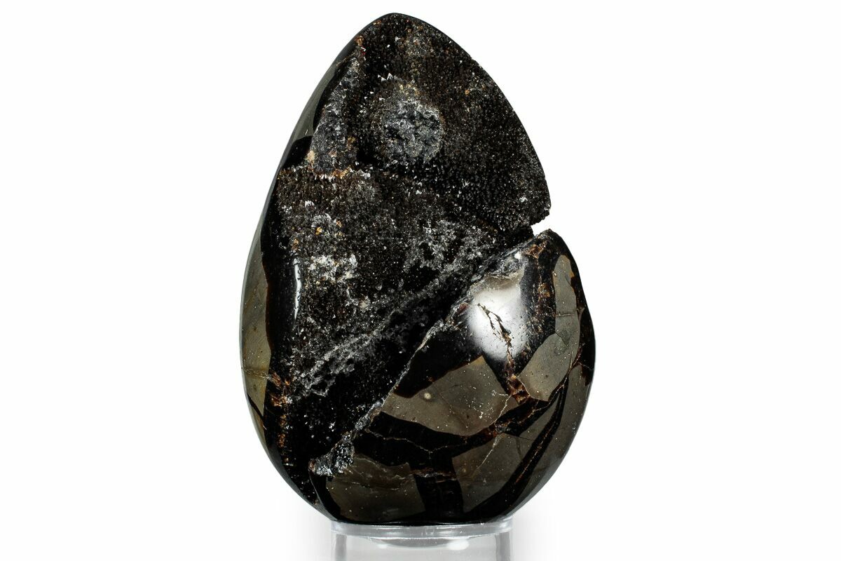 This is a gorgeous septarian "dragon egg" geode collected in the Betsiboka Region of Madagascar. The hollow cavity is full of beautiful, sparkling black & brown calcite crystals. It is a hollow septarian nodule which has been polished into an egg shape, and the natural cracked pattern of the septarian gives it the appearance of a dragons egg. A spectacular display piece which would look great in your home/office or make a great gift for the Game of Thrones enthusiast you know.
