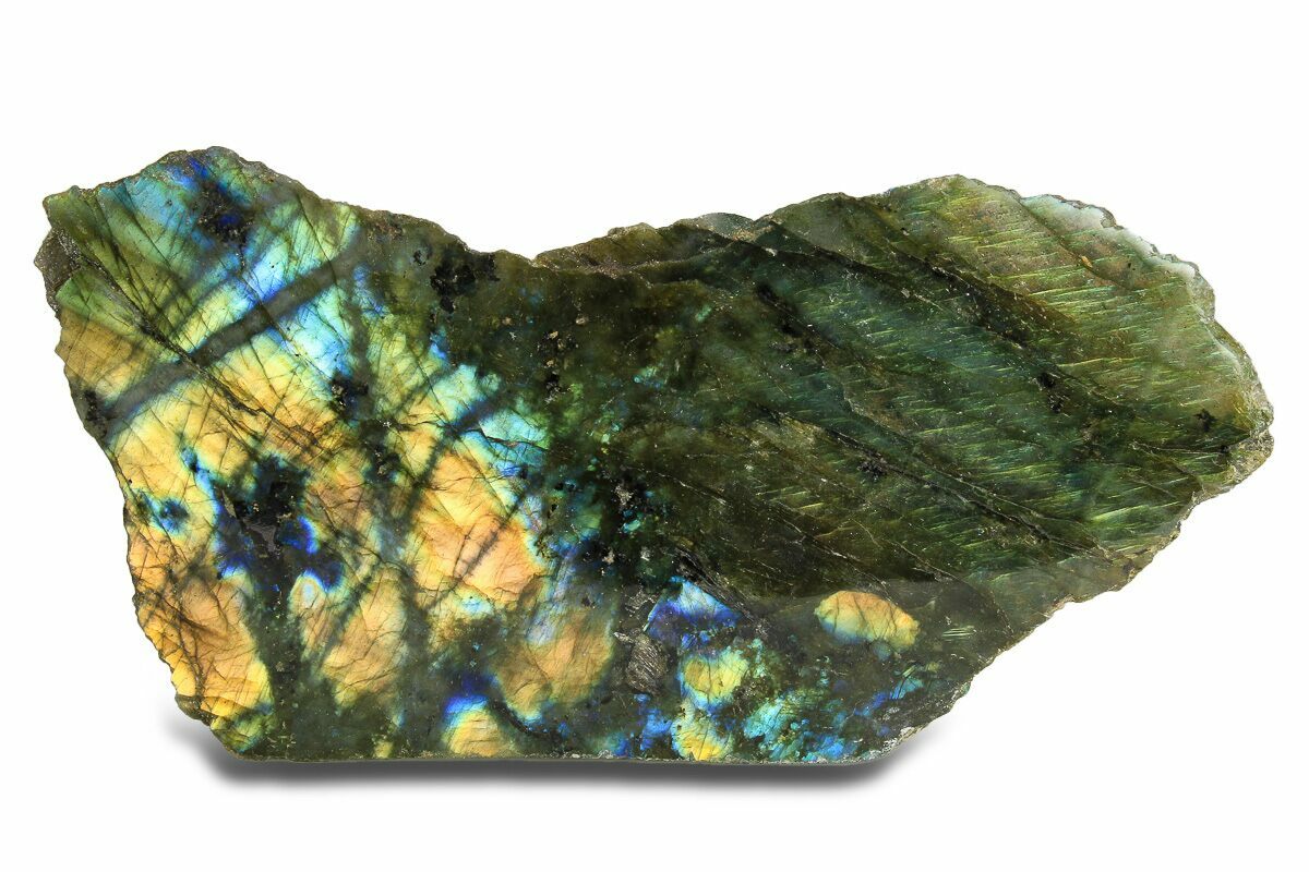 This is a beautiful, 5.15" wide labradorite section with one polished face, collected from Madagascar. The brilliant blue, gold, and green colors have a lot of play in the light, giving the piece an entirely different personality when viewed from different angles and lighting.