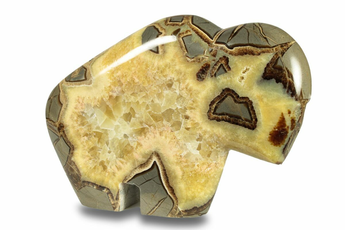 This is a beautiful yellow calcite crystal filled septarian geode from Utah. It has been polished into an abstract bison shape, revealing stunning calcite crystal formations within. The base has been cut flat so that it stands up nicely on a hard surface.