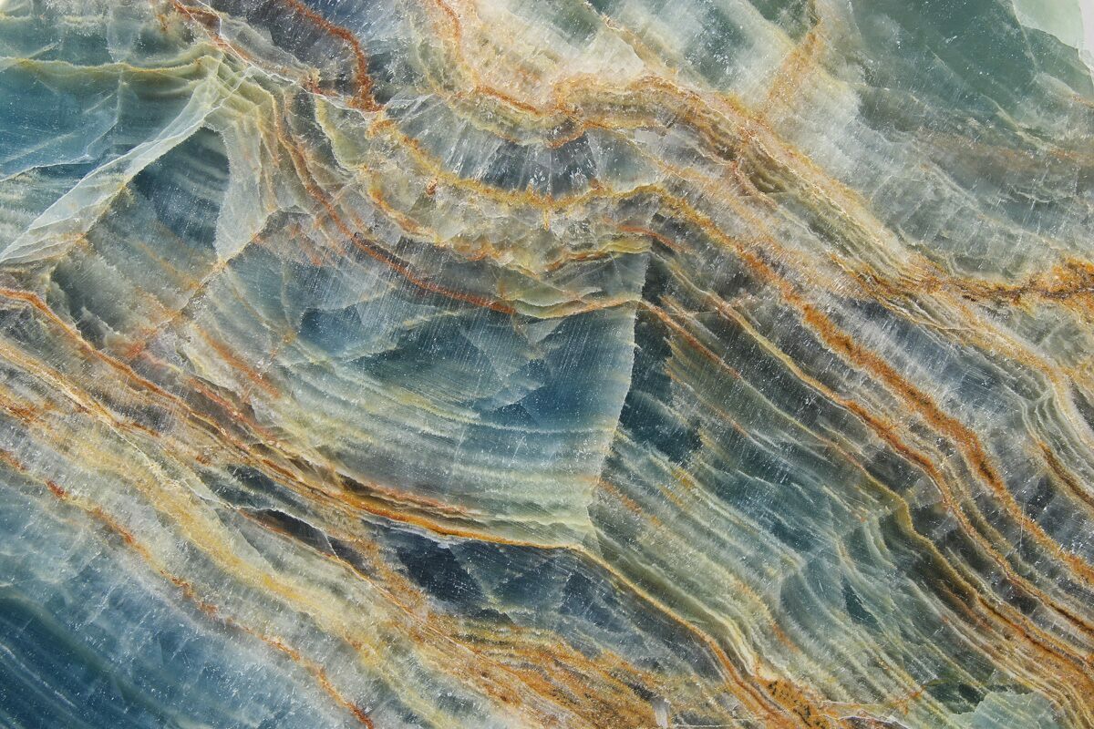 Often sold under the name blue onyx or aquamarine onyx this beautiful, marbled, blue-and-caramel stone is actually calcite and not technically an onyx. It is quarried in the high mountains of Argentina at an elevation of over 17,000 feet and used as an ornamental or decorative stone.