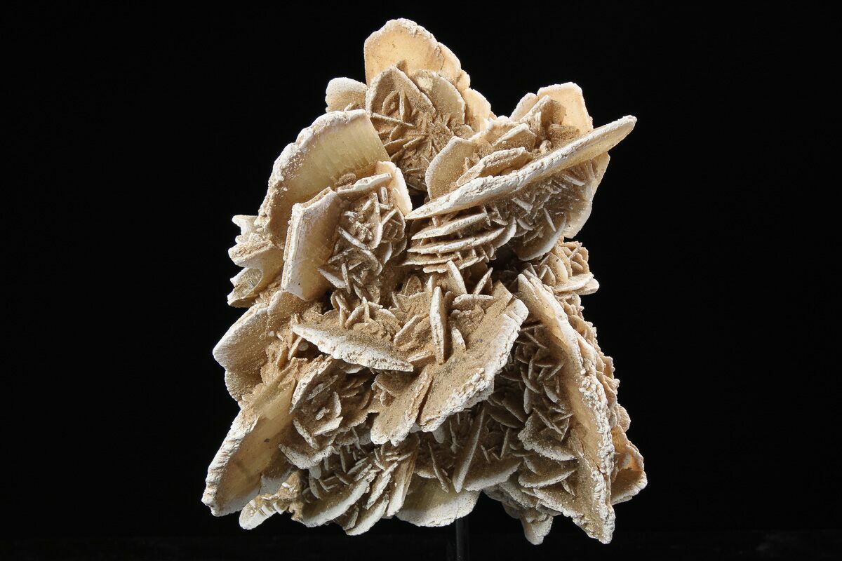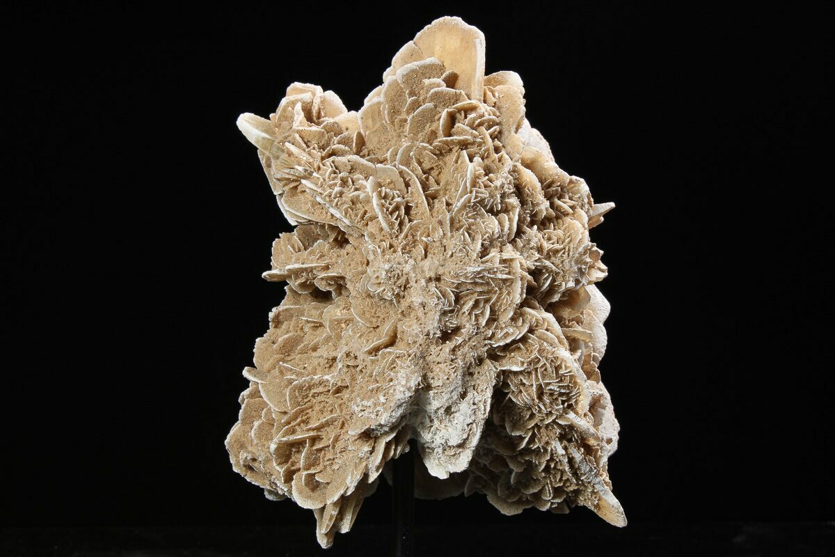 This is 6.0" tall desert rose formation with sharp crystals, collected near Chihuahua, Mexico. This specimen has been mounted to a metal stand for full-view display.