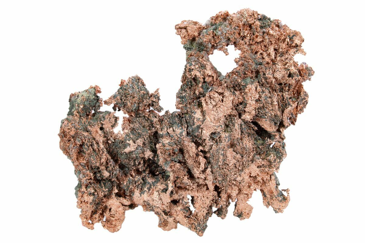 Native copper occurs rarely as isometric cubic and octahedral crystals, but more typically as irregular masses and fracture fillings. It has a reddish, orangish, and/or brownish color on fresh surfaces, but typically is weathered and coated with a green tarnish of copper carbonate.