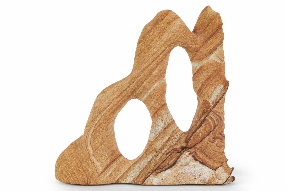 This is a 6.05" wide Toroweap picture sandstone arch. This stunning and distinctive sandstone, mined near Snowflake, Arizona, has been artistically crafted into an arch shape, inspired by natural sandstone formations like Delicate Arch in Arches National Park. The base of this specimen has been cut flat for vertical presentation.