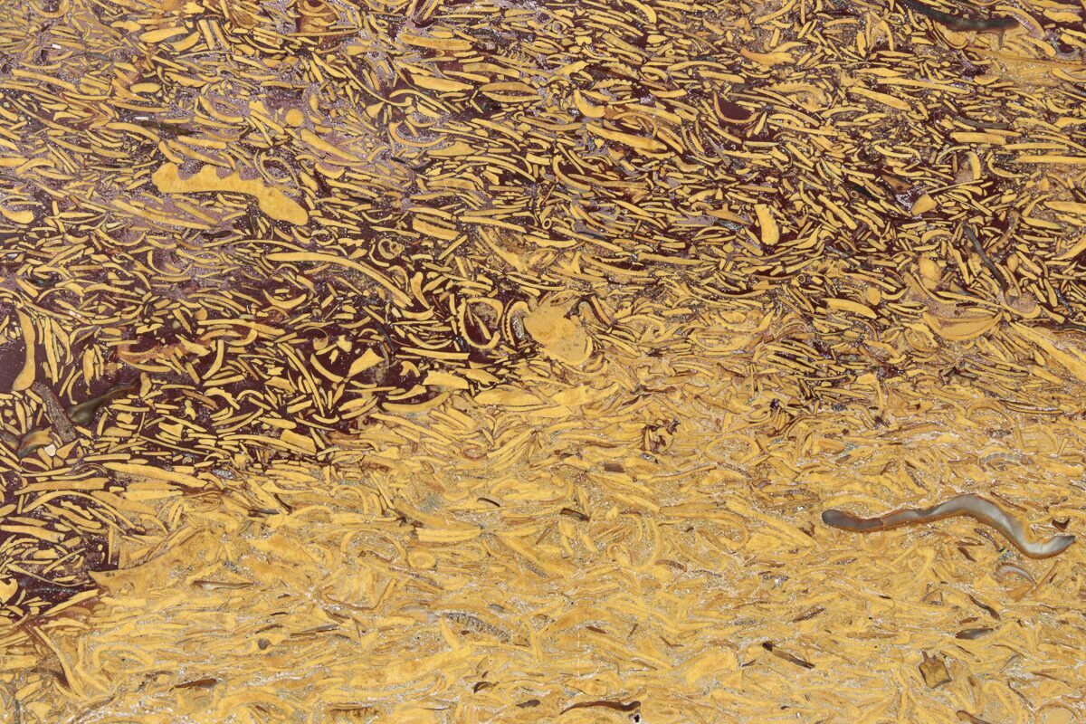 This stone began as a silica-rich mud packed with shell fragments, known as coquina—a term that comes from the Spanish word for cockleshells or shellfish. Coquinas form in high-energy marine environments, like coastlines, where waves and currents wear down, break, and sort the shells. Over time, these fragments fossilized, and the silica-rich mud transformed into jasper. The vibrant orange color comes from iron oxidation.