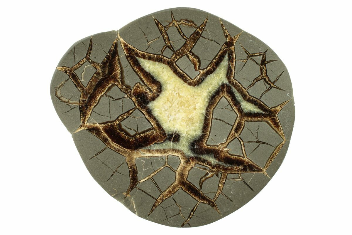 This is an end-cut from a gorgeous septarian nodule, collected in Utah. It has a beautiful pattern due to the aragonite and calcite filling in cracks. It comes with an acrylic display stand.