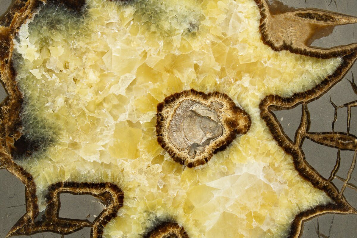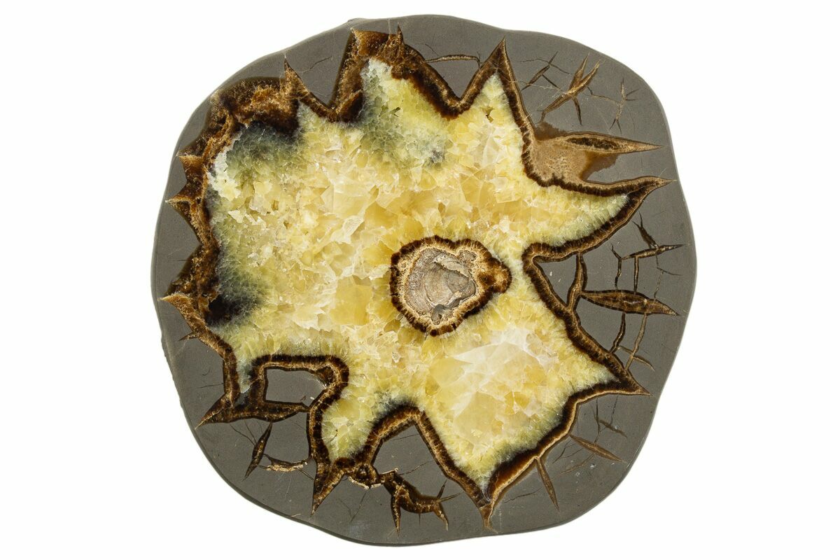 This is a beautiful polished slice from a septarian nodule. This septarian was mined West of Orderville, Utah and was deposited during the Late Cretaceous, about 100 million years ago. The contrast between the grey limestone, yellow calcite crystals, and brown aragonite is quite stunning. It has been polished on one side and displays well on the included display stand.