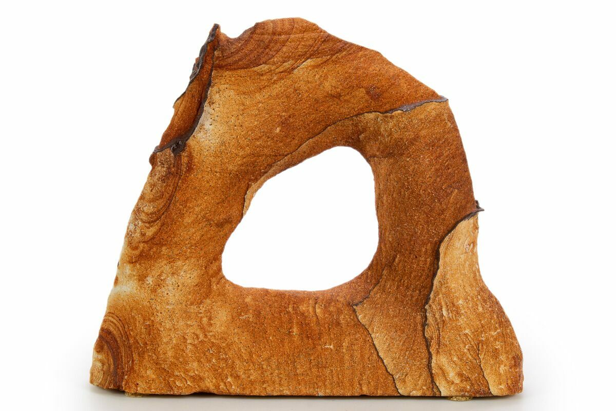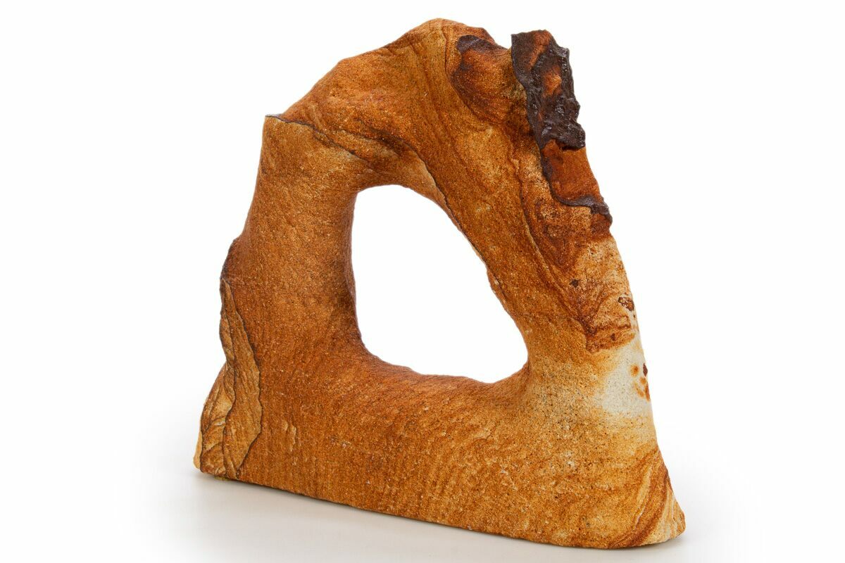 This is a 6.15" wide Toroweap picture sandstone arch. This stunning and distinctive sandstone, mined near Snowflake, Arizona, has been artistically crafted into an arch shape, inspired by natural sandstone formations like Delicate Arch in Arches National Park. The base of this specimen has been cut flat for vertical presentation.