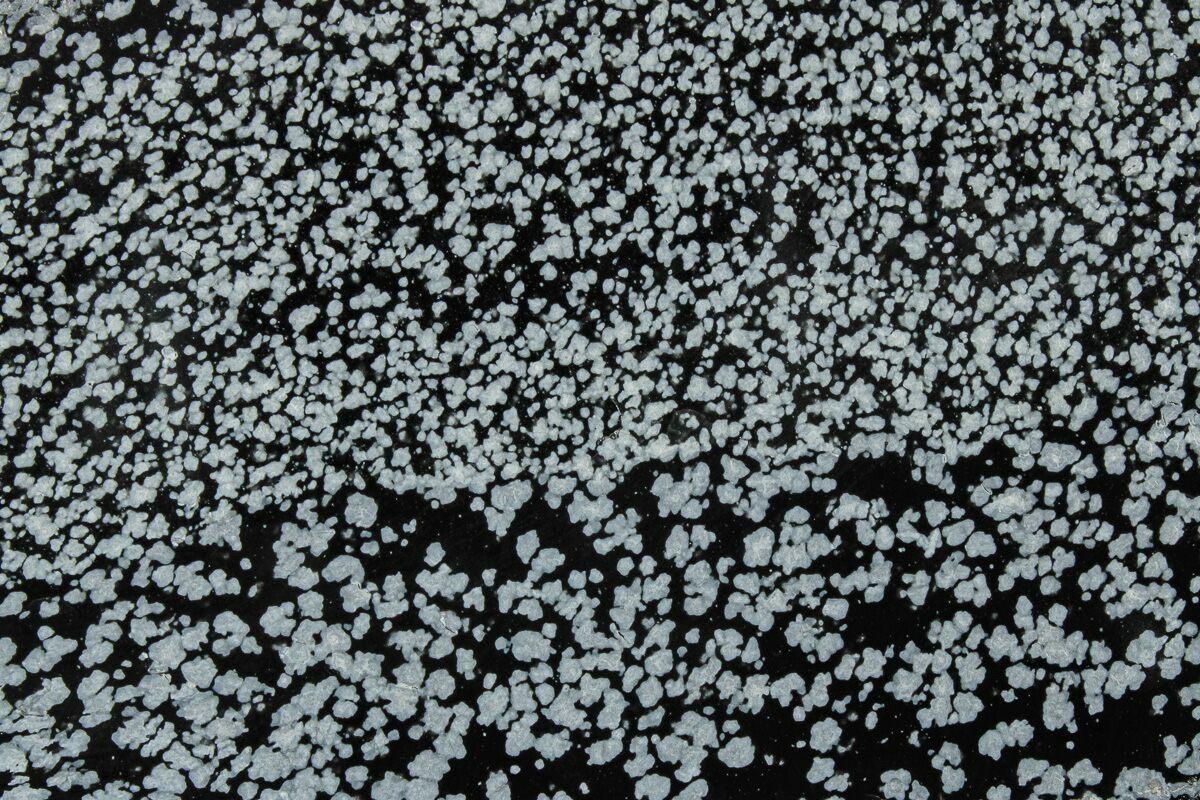 Unlike most of the material that comes from the famous location near Sevier Lake in Millard County, Utah, this snowflake obsidian is found at Obsidian Cliff in Wyoming. It is a natural volcanic "glass" that forms when molten rock cools so quickly that that atoms do not have enough time to arrange themselves into crystals. Instead, the molten material solidifies into an amorphous solid called a glass. The "snowflakes" in the obsidian are small, white, radially clustered crystals of cristobalite, a mineral polymorph of silica.