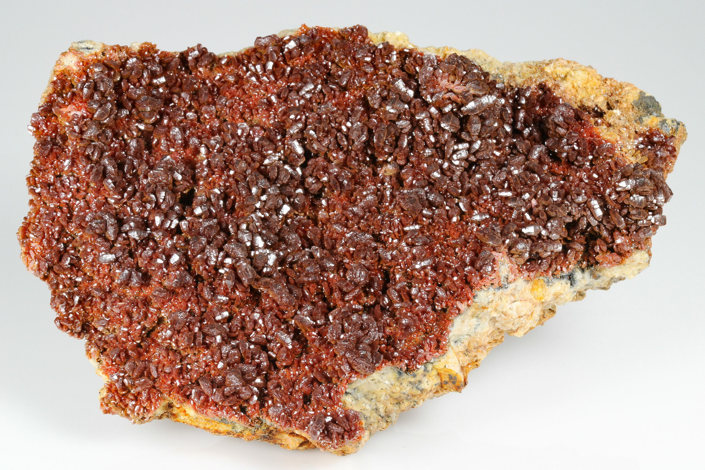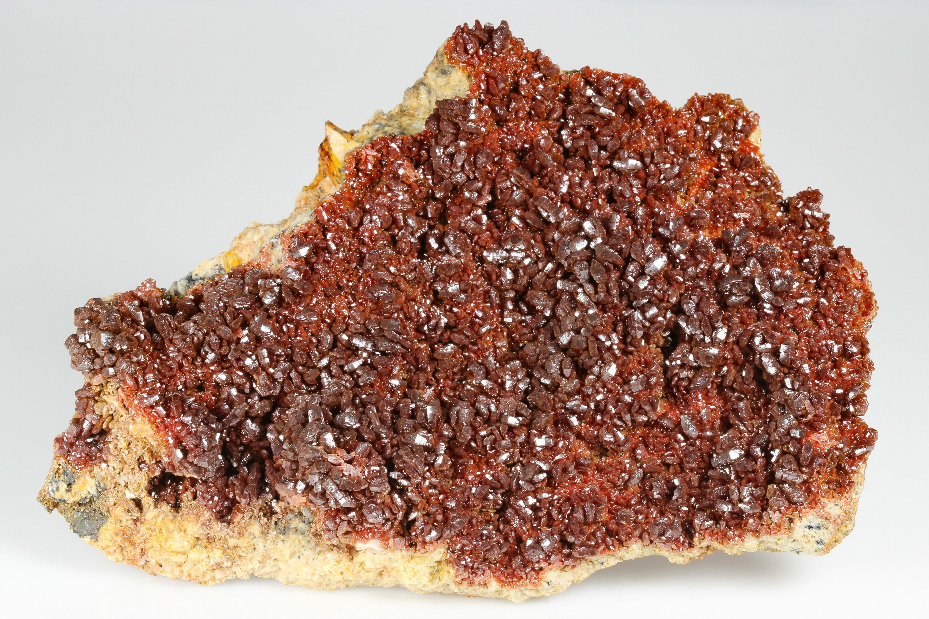 This is a beautiful plate of sparkling, ruby-red vanadinite crystals on matrix, collected from Mibladen, Morocco. The vanadinite crystals are on the smaller side but cover most of the specimen and exhibit a gorgeous luster.