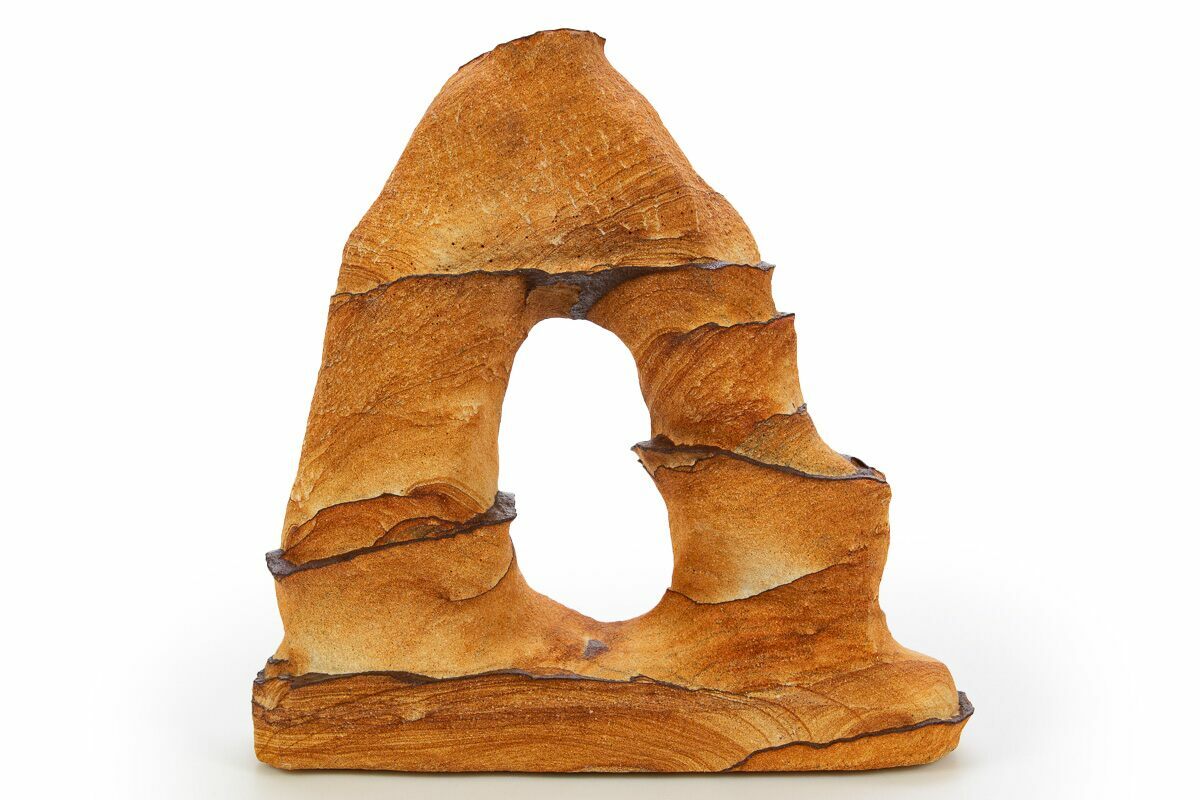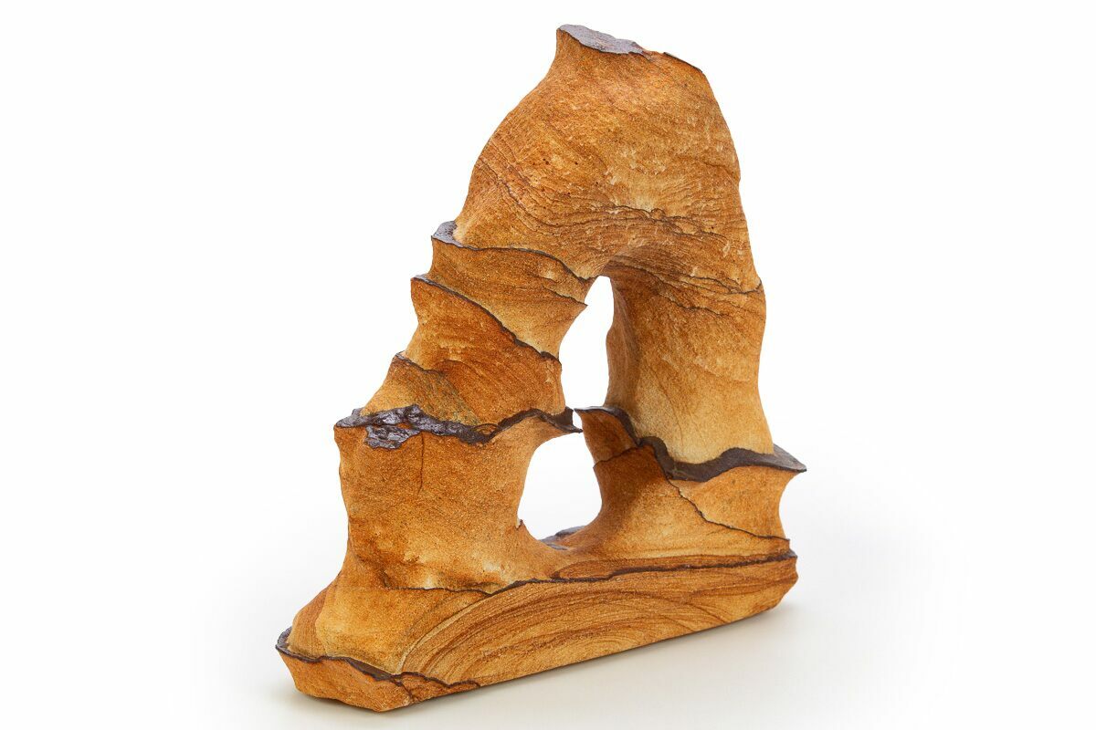 This is a 6.2" tall Toroweap picture sandstone arch. This stunning and distinctive sandstone, mined near Snowflake, Arizona, has been artistically crafted into an arch shape, inspired by natural sandstone formations like Delicate Arch in Arches National Park. The base of this specimen has been cut flat for vertical presentation.