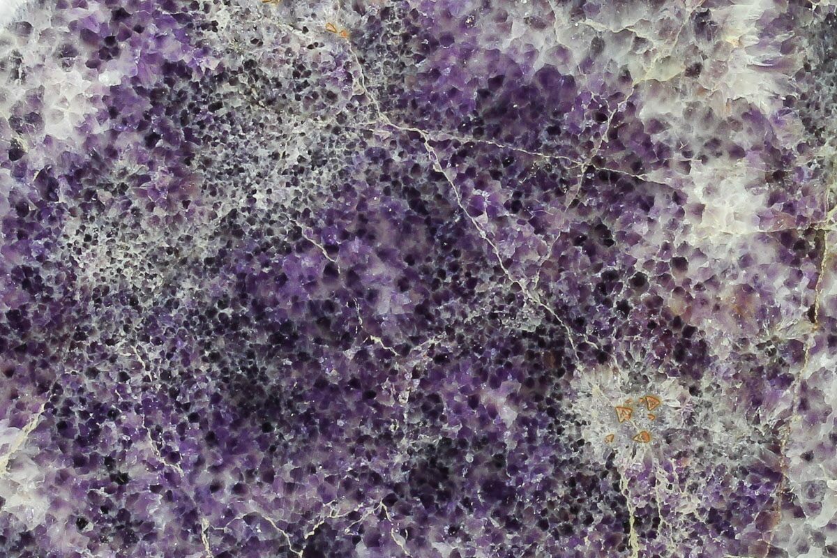 Amethyst is a purple variety of quartz (SiO2) that owes its violet color to natural gamma irradiation, iron impurities, and the presence of trace elements, which result in complex crystal lattice substitutions. It is considered a semi-precious gemstone, and just two centuries ago was considered to have a value on par with diamonds, sapphires, and rubies. The largest and best known amethyst deposits occur in southern Brazil and Uruguay, where they are found in hydrothermally-formed geodes, but many localities around the world produce an amazing variety of amethyst crystals and formations. They are almost always formed in medium- to high-temperature geological settings.