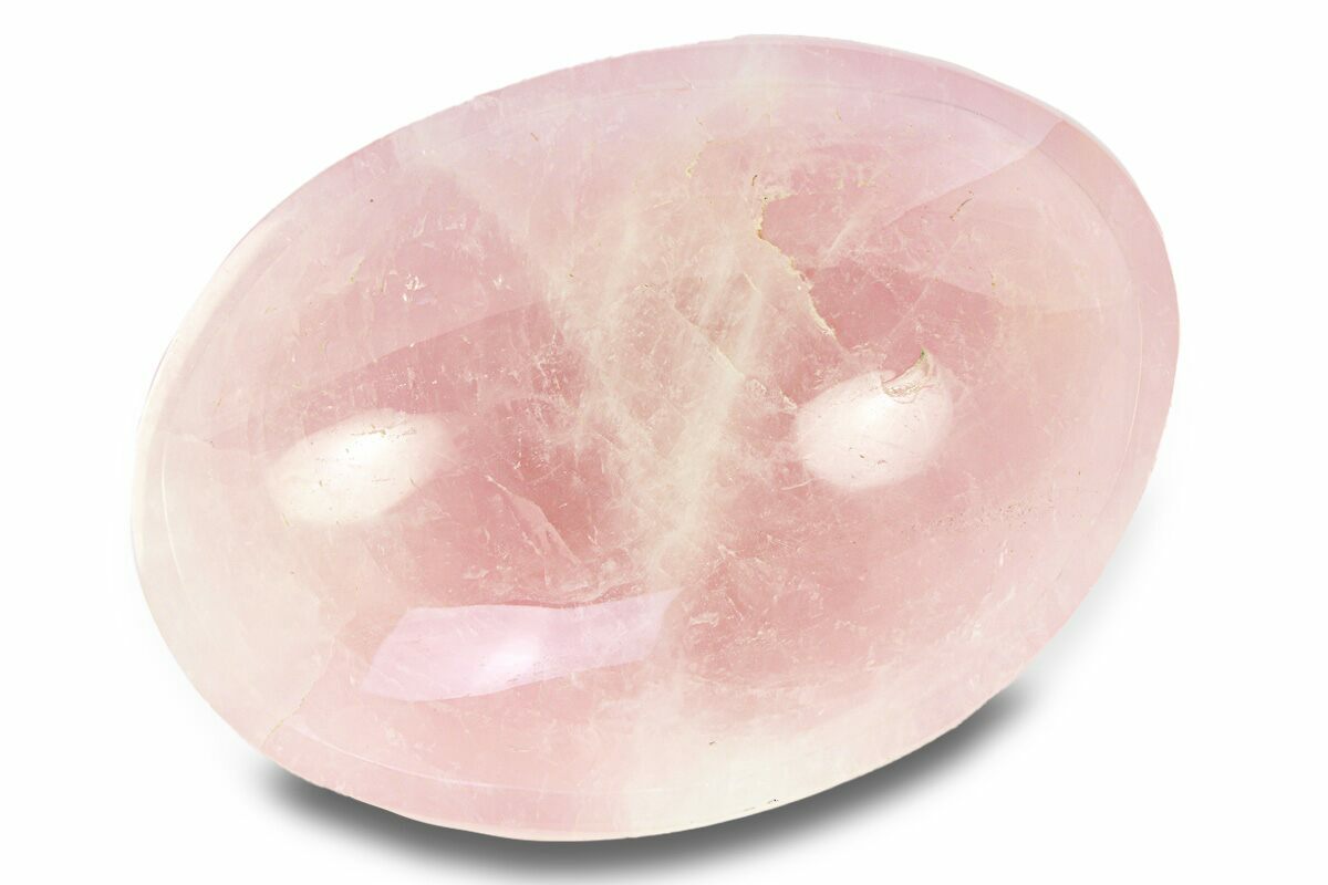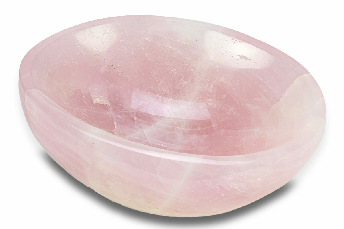 This is a gorgeous, 6.25" wide, polished rose quartz bowl. It has been hand carved/polished out of a solid piece of rose quartz crystal.