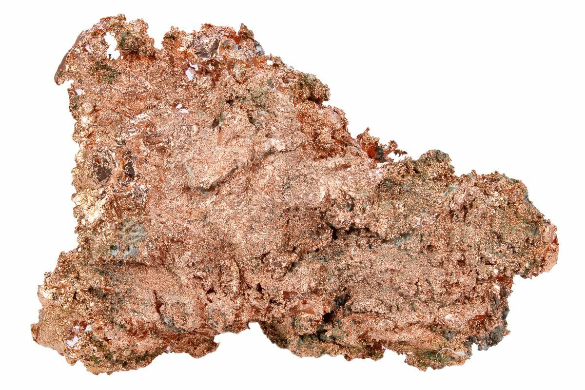 Native copper occurs rarely as isometric cubic and octahedral crystals, but more typically as irregular masses and fracture fillings. It has a reddish, orangish, and/or brownish color on fresh surfaces, but typically is weathered and coated with a green tarnish of copper carbonate.