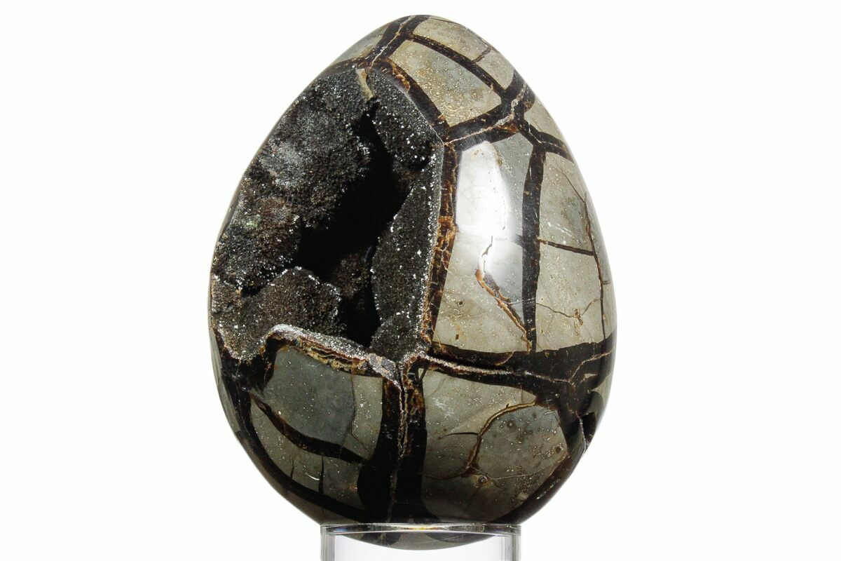 This is a gorgeous septarian "dragon egg" geode collected in the Betsiboka Region of Madagascar. The hollow cavity is full of beautiful, sparkling black & brown calcite crystals. It is a hollow septarian nodule which has been polished into an egg shape, and the natural cracked pattern of the septarian gives it the appearance of a dragons egg. A spectacular display piece which would look great in your home/office or make a great gift for the Game of Thrones enthusiast you know.