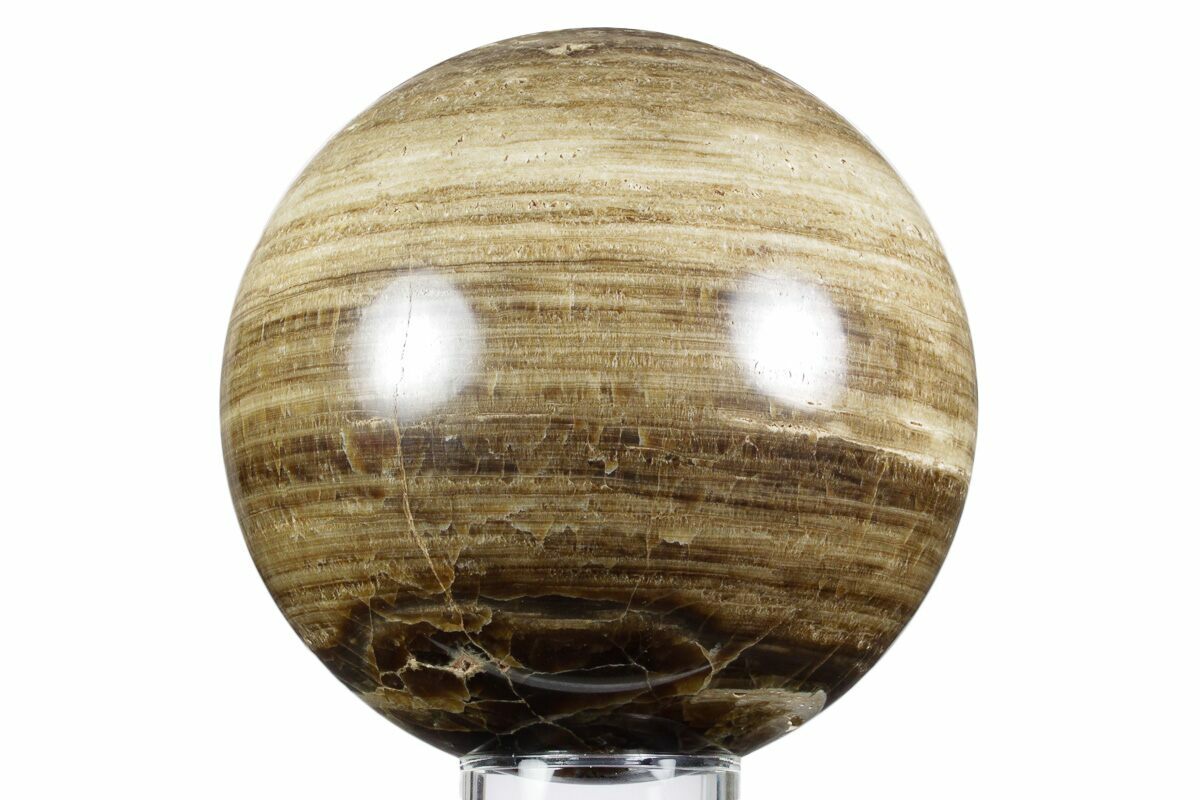 This is a large 6.3" wide chocolate calcite specimen from Pakistan. It has been shaped into perfect sphere and polished to a glossy finish. The swirling patterns in chocolate calcite from Pakistan are one of its most captivating features. These natural bands twist and flow in layers of rich brown, caramel, and creamy beige, resembling molten chocolate or marbled dessert. Formed through rhythmic mineral deposition over time, the bands reflect subtle shifts in mineral content, pressure, and fluid movement within the host rock. The result is a visually dynamic pattern that appears to ripple across the surface, giving each polished piece a sense of motion and depth.