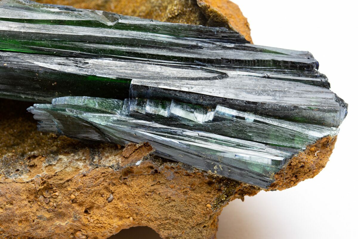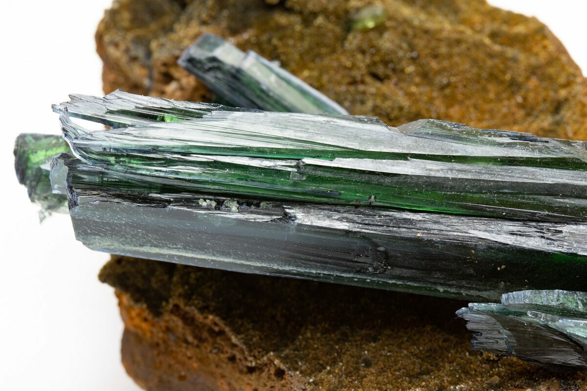 Vivianite is a hydrous iron phosphate mineral that appears in flat, prismatic crystals. This mineral is highly sought after for its deep teal coloring and crisp translucence. It looks like a mystical glass that may be found in a fantasy movie. While it is commonly an iron phosphate mineral, occasionally the iron ion maybe substituted for magnesium, calcium, or manganese.