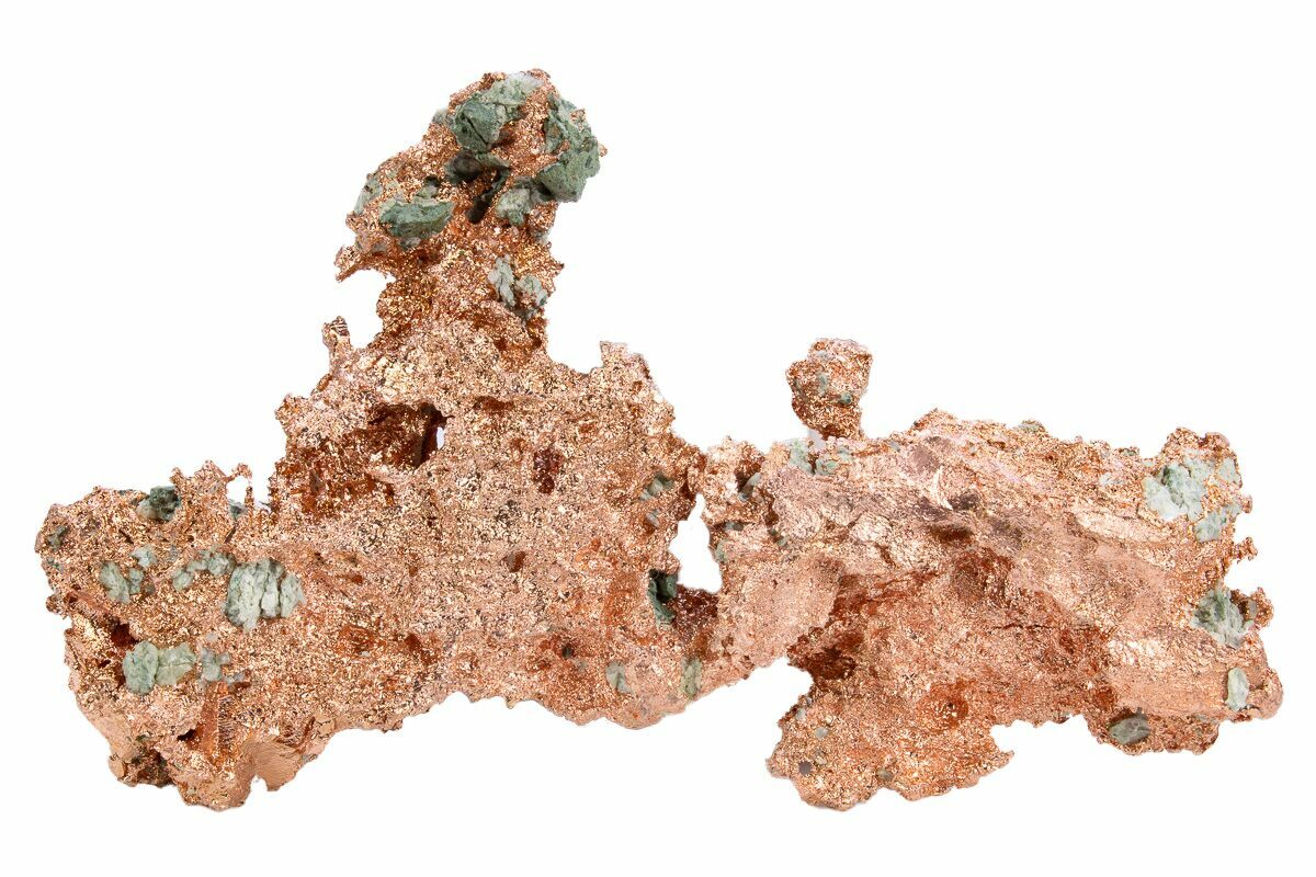 Native copper occurs rarely as isometric cubic and octahedral crystals, but more typically as irregular masses and fracture fillings. It has a reddish, orangish, and/or brownish color on fresh surfaces, but typically is weathered and coated with a green tarnish of copper carbonate.