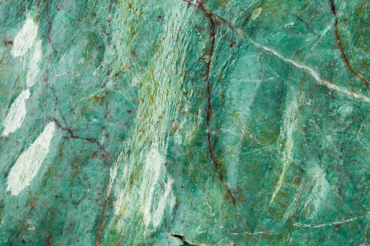 Fuchsite chert, also commonly referred to as "Dragon Stone", is cryptocrystalline quartz stone metamorphosed from fuchsite. It forms when a fuchsite vein is subjected to intense pressure and dissolution from super hot ground waters, which partially dissolve the fuchsite into a silica solution, forming large boulders. Much of the material retains fuchsite's emerald green coloring, but can also be found in lighter shades of green. Fuchsite, also known as chrome mica, is a chromium-rich variety of the mineral muscovite.