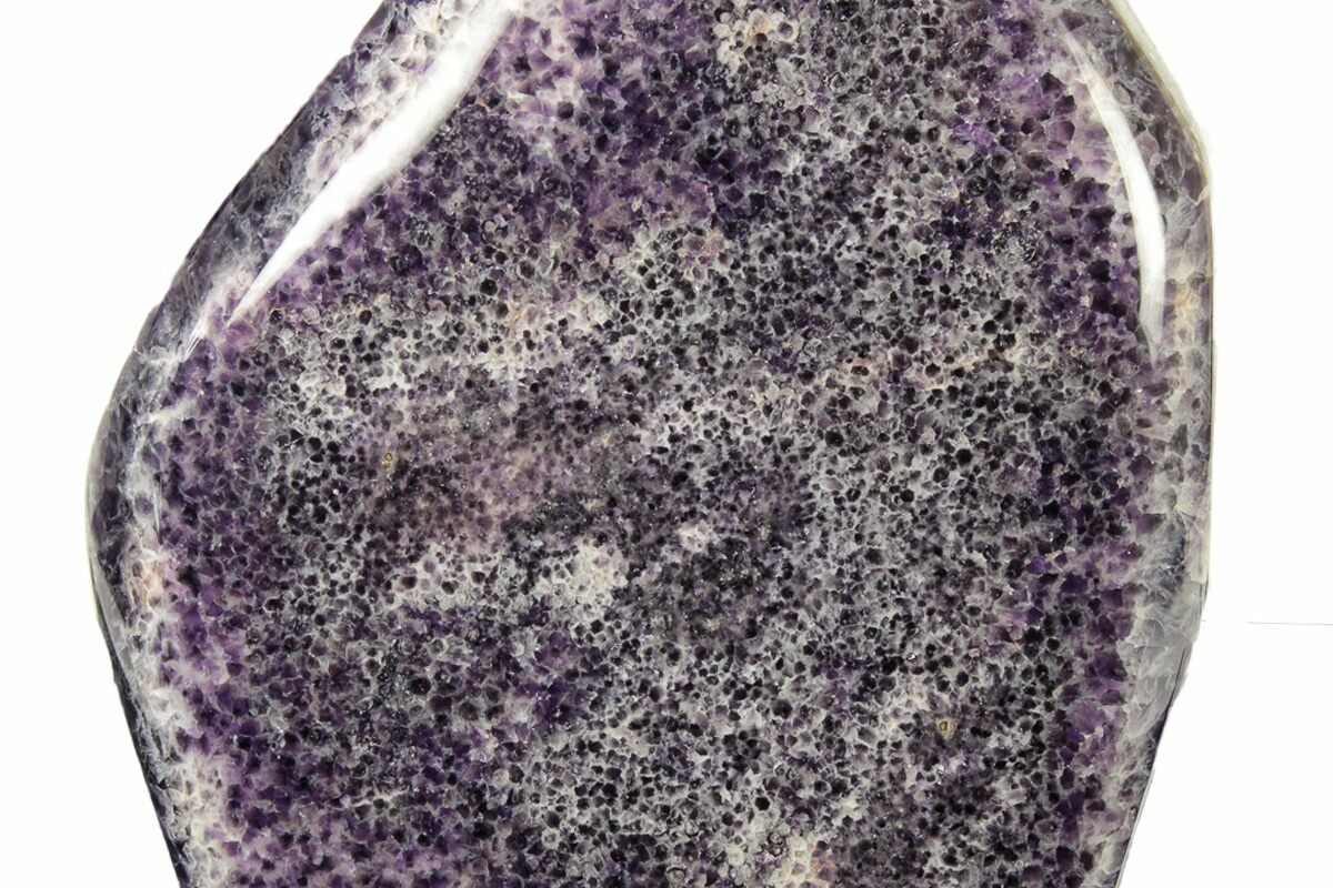 This is a beautiful free-standing sculpture made from a deep-purple amethyst formation known as chevron amethyst. The bottom of the specimen has been cut flat so that it stands nicely on its own. This specimen was collected, cut, and polished in Madagascar. It has a natural pocket revealing points on exposed crystals.