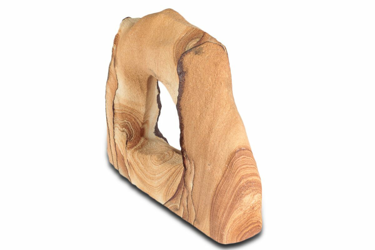 This is a 6.4" wide Toroweap picture sandstone arch. This stunning and distinctive sandstone, mined near Snowflake, Arizona, has been artistically crafted into an arch shape, inspired by natural sandstone formations like Delicate Arch in Arches National Park. The base of this specimen has been cut flat for vertical presentation.