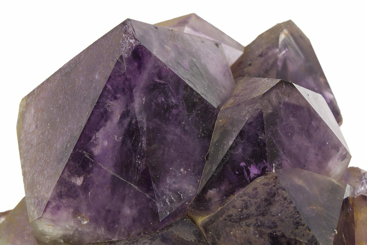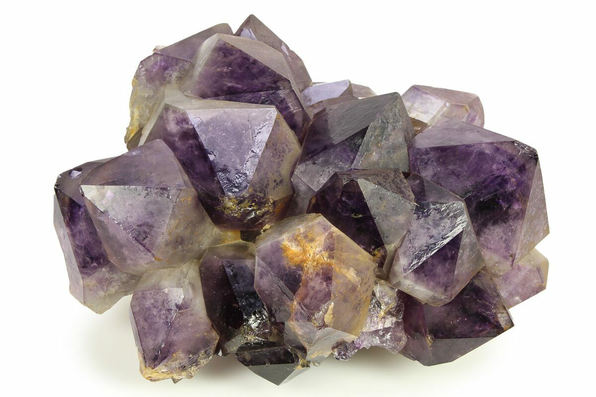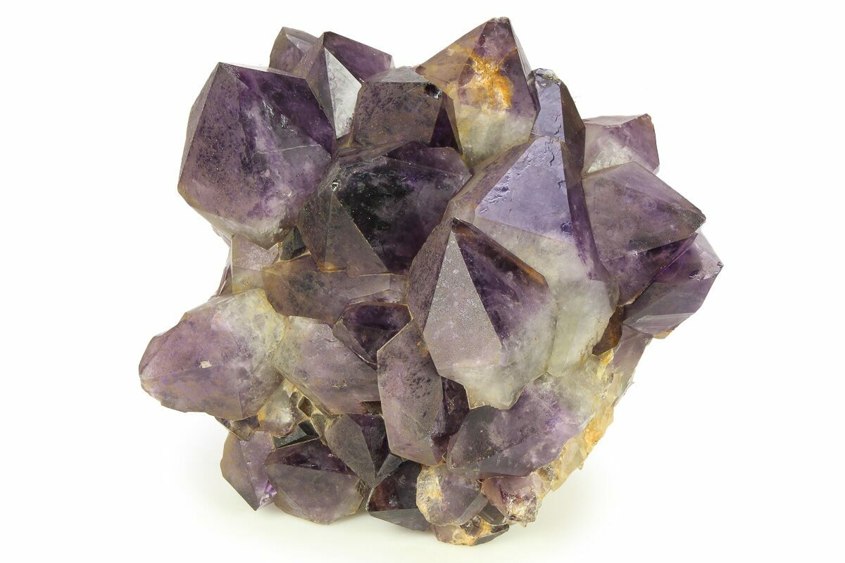 This is a stunning, 6.5" wide amethyst crystal cluster with beautiful purple coloration and exceptional luster, collected from the Democratic Republic of the Congo. These crystals have undergone no color treatment or polishing. The orange-red color across some of the crystals can be attributed to iron oxidation.