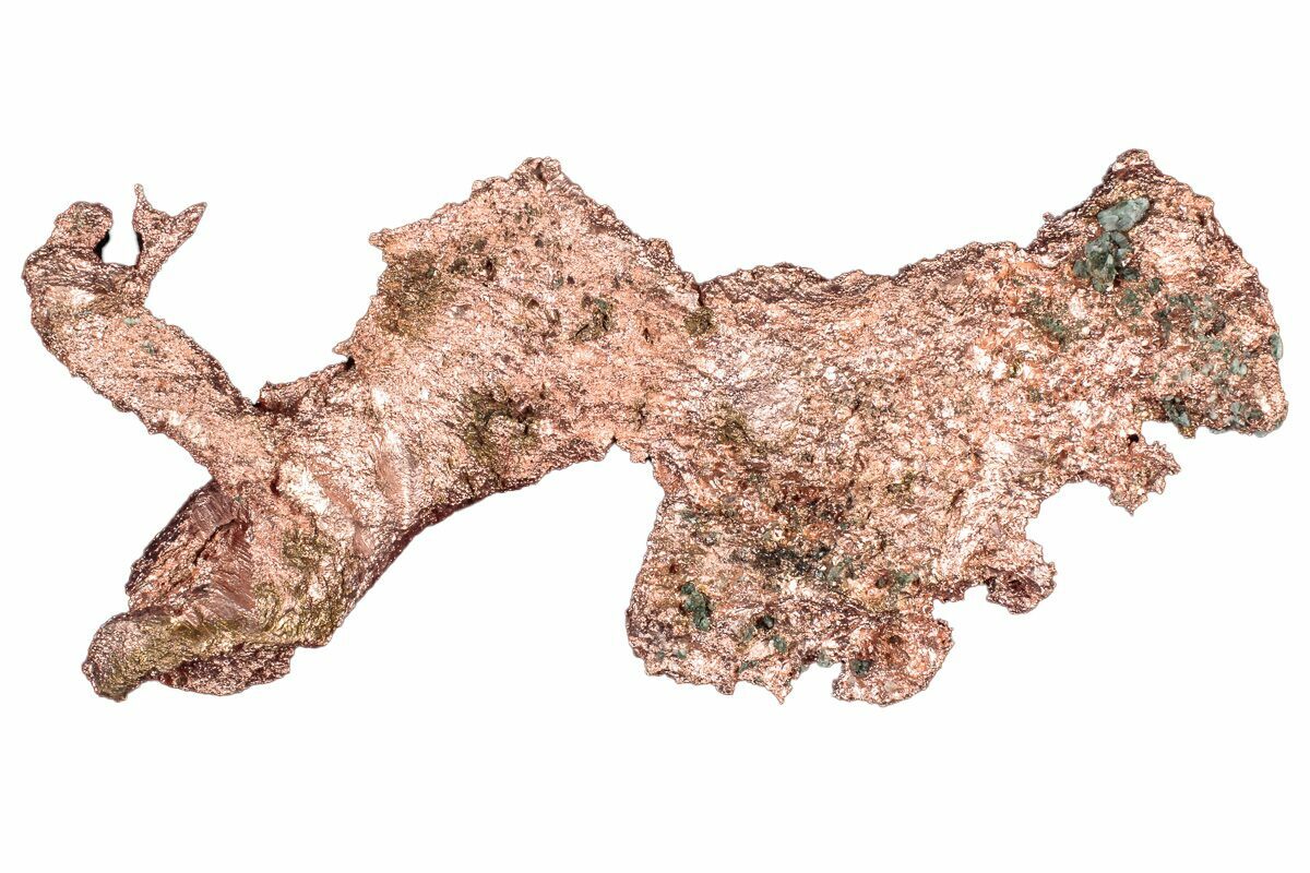 Native copper occurs rarely as isometric cubic and octahedral crystals, but more typically as irregular masses and fracture fillings. It has a reddish, orangish, and/or brownish color on fresh surfaces, but typically is weathered and coated with a green tarnish of copper carbonate.