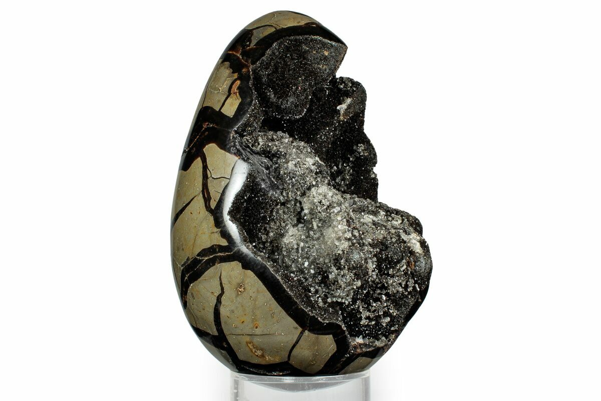 This is a gorgeous septarian "dragon egg" geode collected in the Betsiboka Region of Madagascar. The hollow cavity is full of beautiful, sparkling black & brown calcite crystals. It is a hollow septarian nodule which has been polished into an egg shape, and the natural cracked pattern of the septarian gives it the appearance of a dragons egg. A spectacular display piece which would look great in your home/office or make a great gift for the Game of Thrones enthusiast you know.