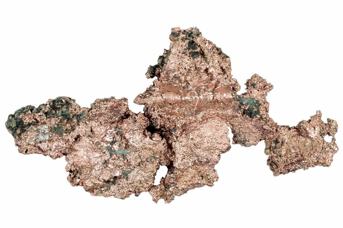 Native copper occurs rarely as isometric cubic and octahedral crystals, but more typically as irregular masses and fracture fillings. It has a reddish, orangish, and/or brownish color on fresh surfaces, but typically is weathered and coated with a green tarnish of copper carbonate.