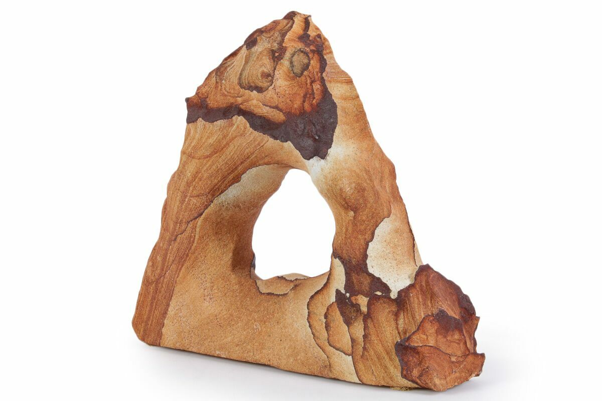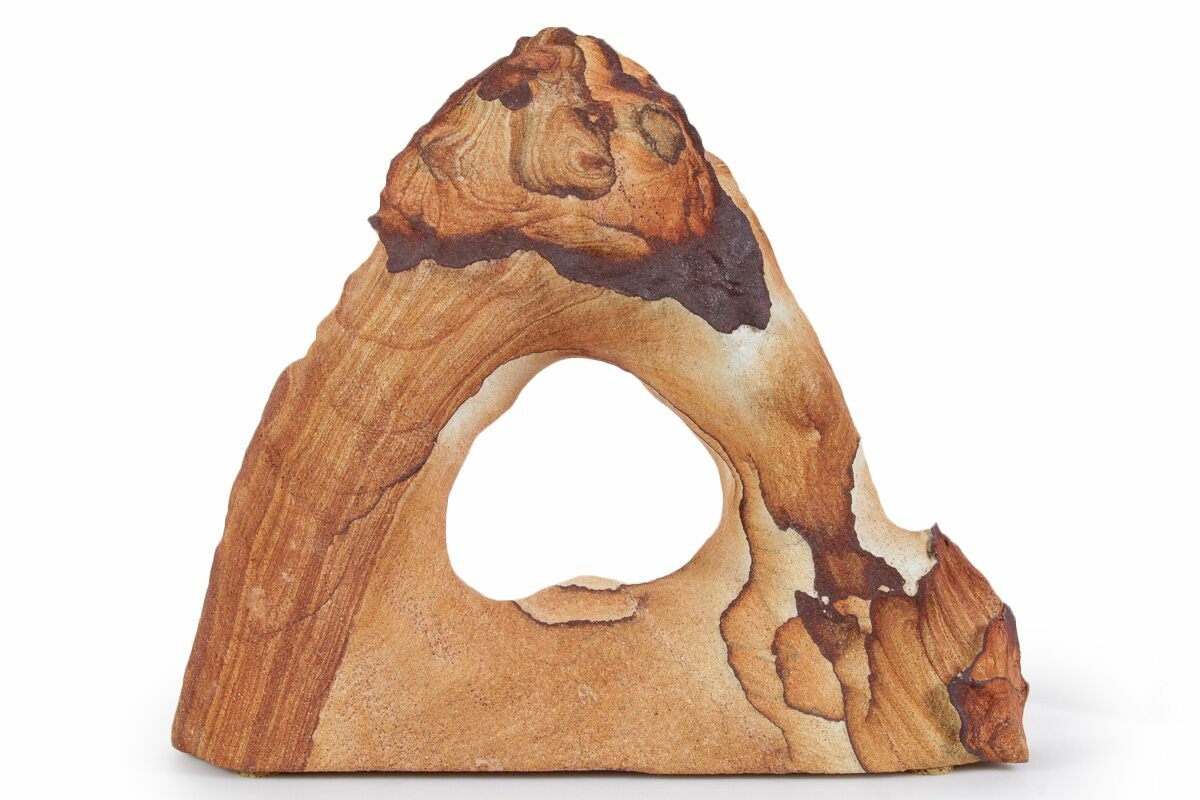 This is a 6.6" wide Toroweap picture sandstone arch. This stunning and distinctive sandstone, mined near Snowflake, Arizona, has been artistically crafted into an arch shape, inspired by natural sandstone formations like Delicate Arch in Arches National Park. The base of this specimen has been cut flat for vertical presentation.