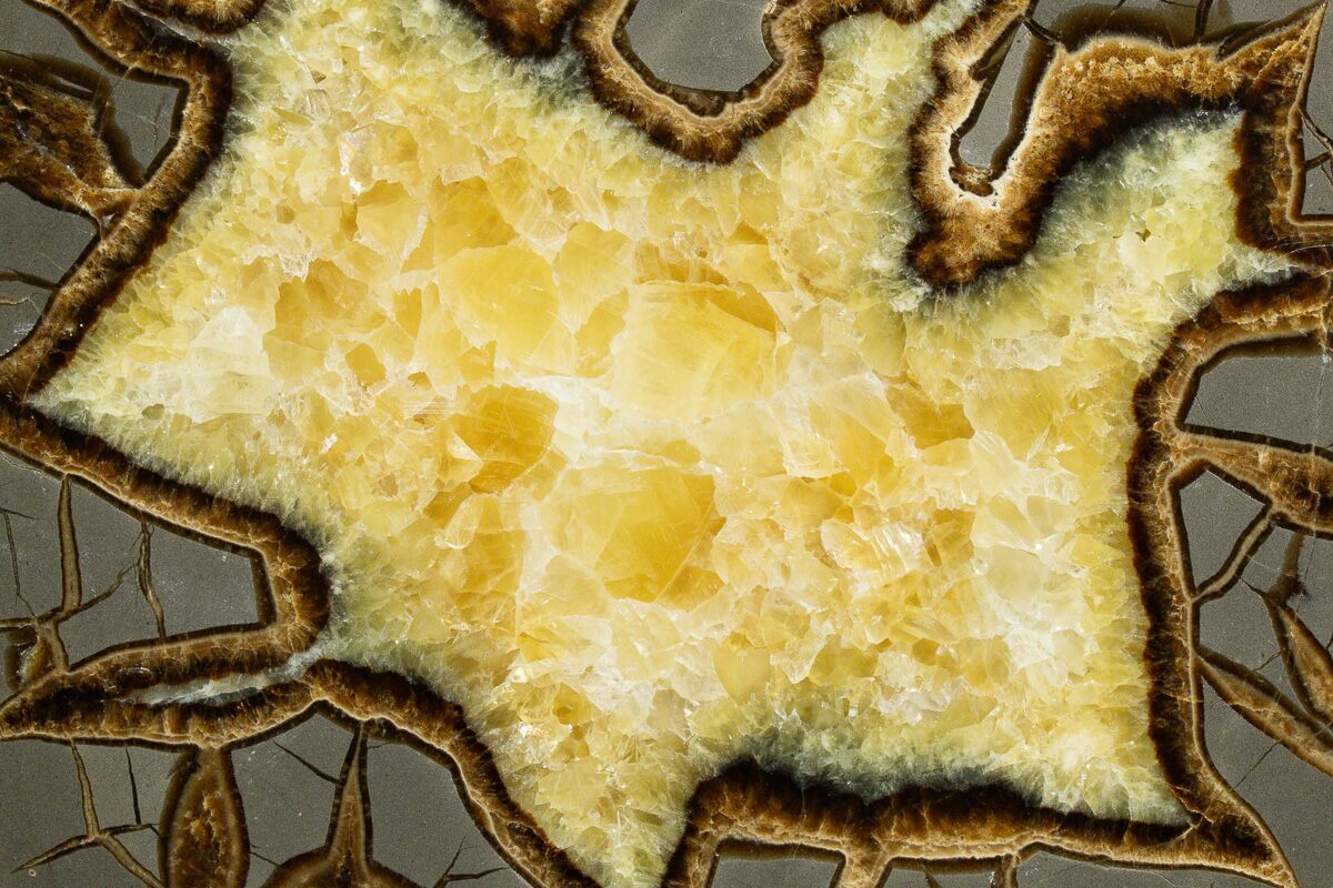 This is a beautiful polished slice from a septarian nodule. This septarian was mined West of Orderville, Utah and was deposited during the Late Cretaceous, about 100 million years ago. The contrast between the grey limestone, yellow calcite crystals, and brown aragonite is quite stunning. It has been polished on one side and displays well on the included display stand.