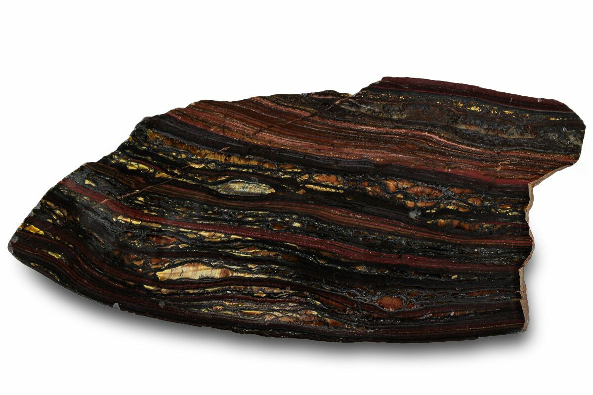 Tiger Iron is composed mainly of tiger's eye, red jasper, and black hematite in an undulating banded pattern. It is mined primarily in two large deposits, one in South Africa and the other in Western Australia. Both deposits are over 2 billion years old!