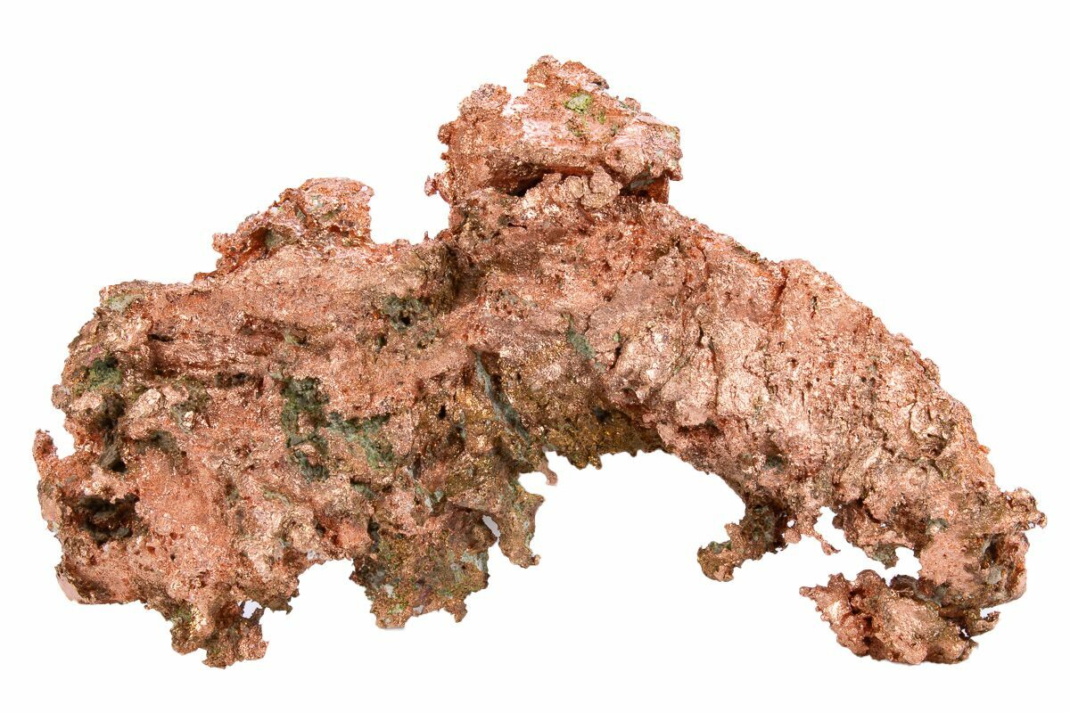 Native copper occurs rarely as isometric cubic and octahedral crystals, but more typically as irregular masses and fracture fillings. It has a reddish, orangish, and/or brownish color on fresh surfaces, but typically is weathered and coated with a green tarnish of copper carbonate.