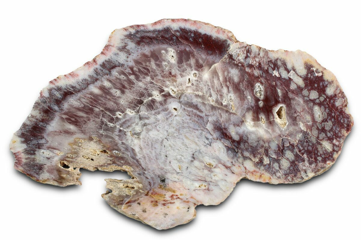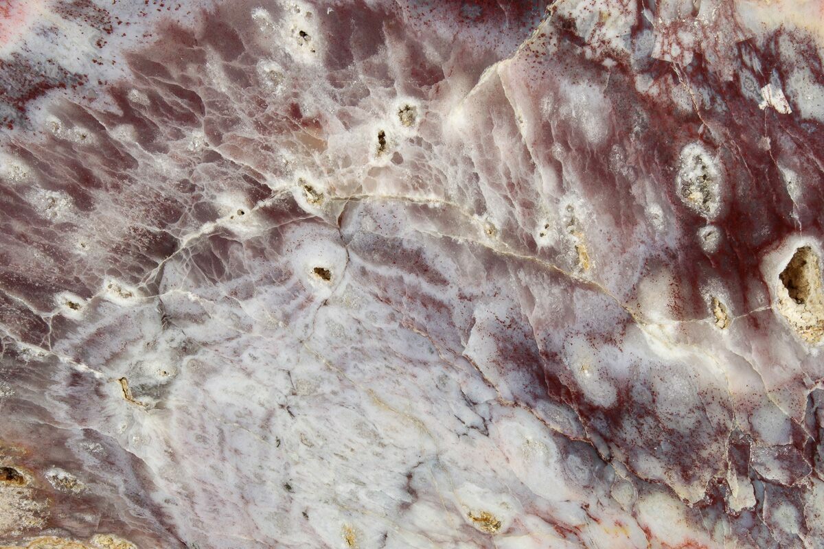 This is a colorful slab of agate that displays a mixture of red, purple, and pink hues. It measures 6.7" wide and has been polished to a glossy finish on one side.