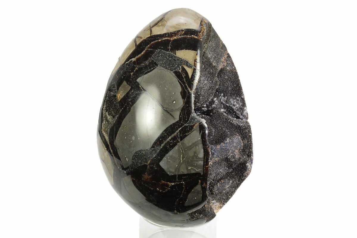This is a really cool Septarian "Dragon Egg" geode collected in the Betsiboka Region of Madagascar. The hollow cavity is full of beautiful calcite crystals. It is a hollow septarian nodule, which has been polished into an egg shape, and the natural cracked pattern of the septarian gives it the appearance of a dragons egg. A spectacular display piece which would look great in your home/office, or make a great gift for the Game of Thrones enthusiast you know.