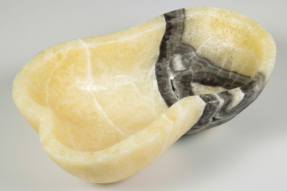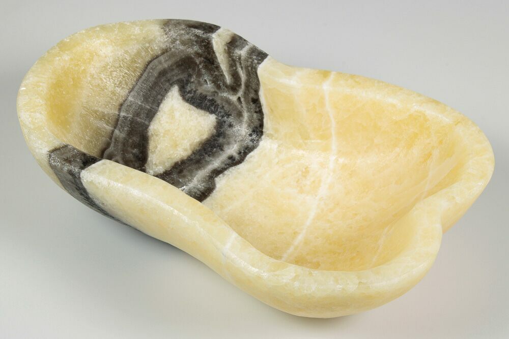 This is a 6.8" wide banded zebra calcite dish. Zebra calcite may also be referred to as Raw Phantom Calcite, but both names point to the same mineral. This specimen features a field of golden calcite/aragonite interlaced with black and brown banding. It makes an excellent display piece and a great vessel for other items. The texture of these dishes is quite unique and enjoyable in the hands.