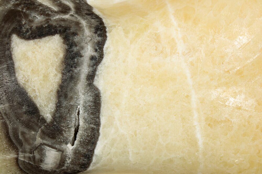 Zebra calcite, also known as "phantom calcite" or "butterfly calcite," is a striking variety of calcite characterized by bold, contrasting bands of black, white, cream, and brown. These layered patterns resemble the stripes of a zebra, giving the stone its name. Zebra calcite forms through the rhythmic precipitation of calcium carbonate in cavities or fractures within limestone or other host rocks. Over time, variations in mineral content, pressure, and temperature during the deposition process create alternating light and dark bands. The darker layers typically contain inclusions of manganese or other minerals, while the lighter bands are composed of purer calcite.