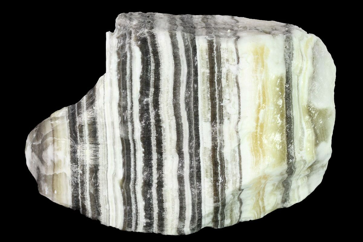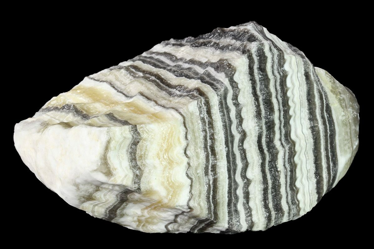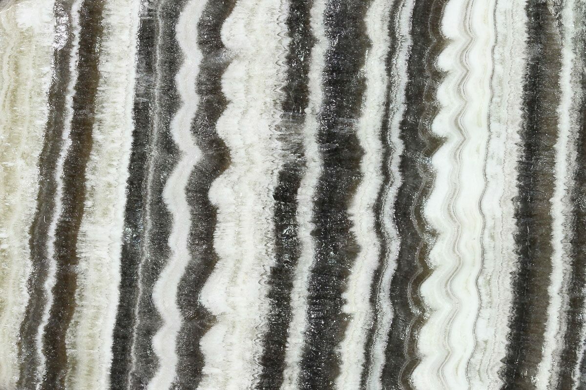 This is a 6.8" wide, free-standing banded zebra calcite section. It features alternating bands of black, brown, white and golden calcite/aragonite. It can be displayed in multiple orientations.