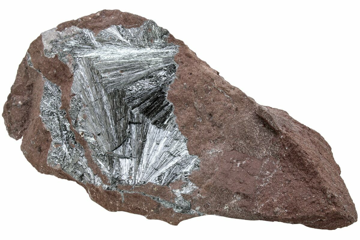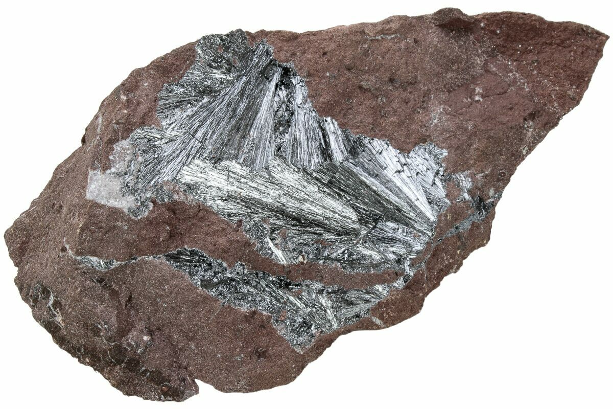 This is a lustrous formation of radiating silver pyrolusite from Morocco. The specimen features several radiating sprays of shiny, metallic crystals in a red-brown, iron-rich matrix.