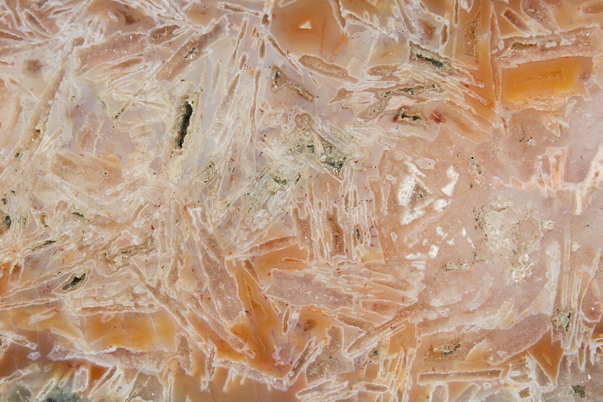This is a fascinating 6.8" wide slab of Moroccan Stick Agate. It is polished to a glossy-finish on one sie and features beautiful aragonite "stick" crystal formations that are encapsulated in agate.
