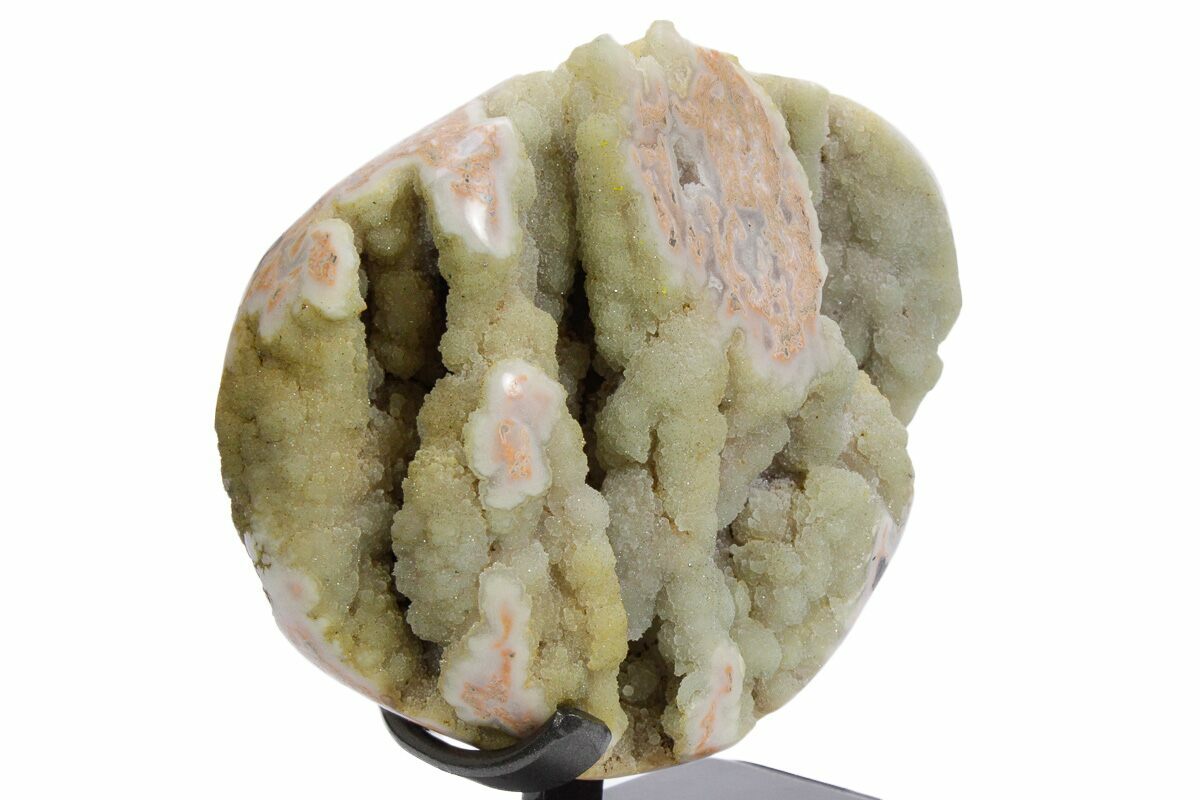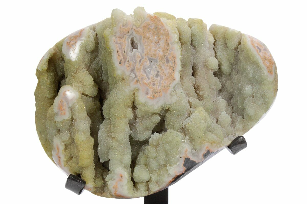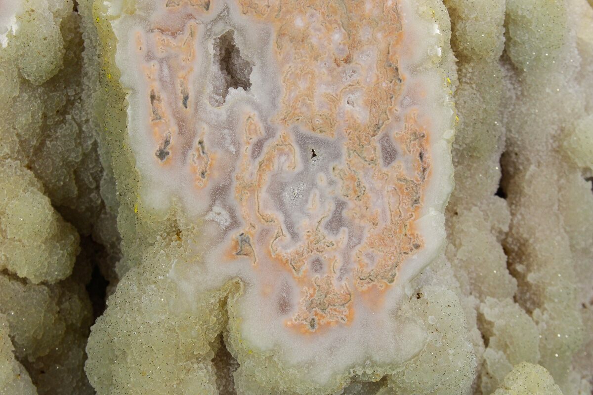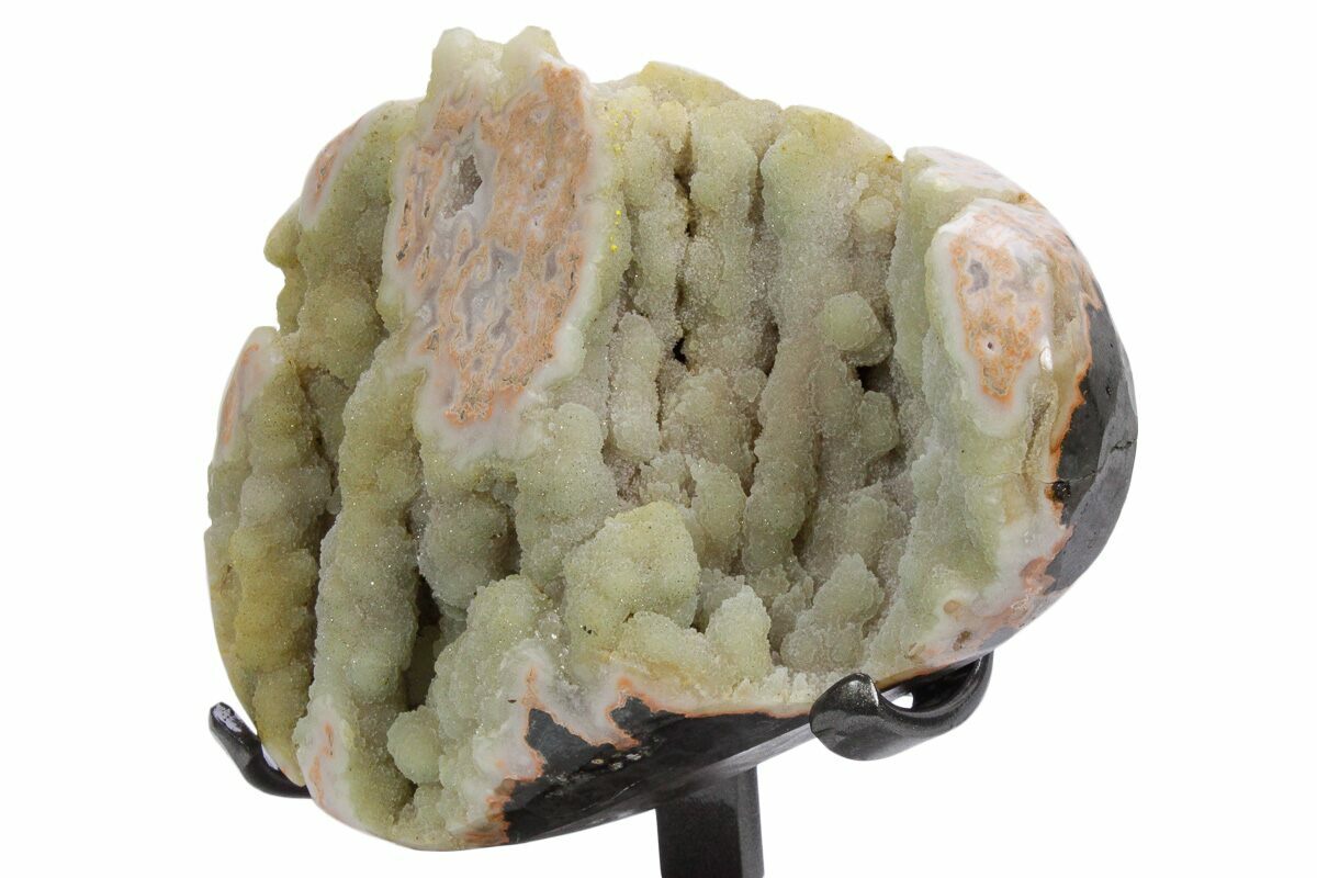 This is a gorgeous druzy quartz geode section from the famous amethyst mines near Artigas, Uruguay. In addition to the beautiful druzy formations, this specimen features a dreamy light green color that really sets this piece apart. Part of the "rind" has been polished to reveal the underlying peach-colored, fibrous mineral aggregations encrusting the basalt matrix.