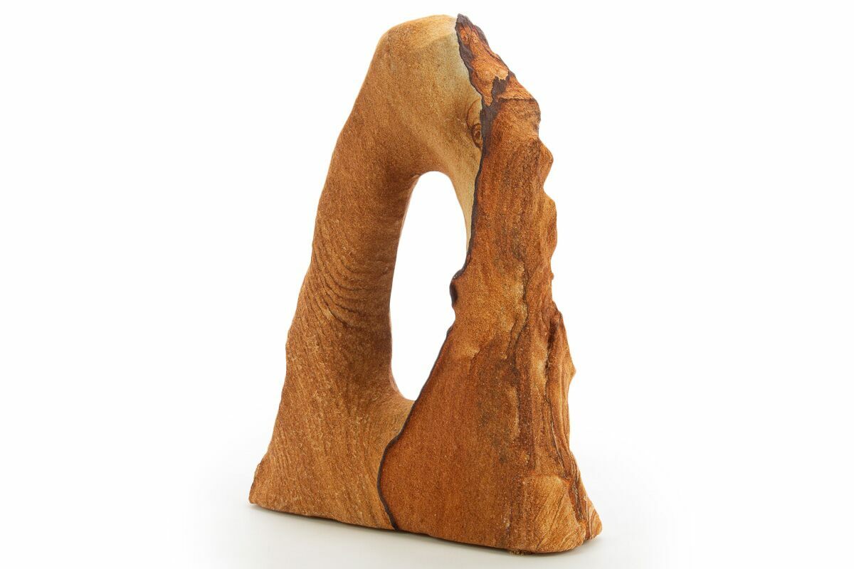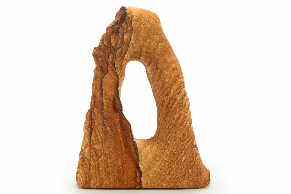 This is a 6.8" tall Toroweap picture sandstone arch. This stunning and distinctive sandstone, mined near Snowflake, Arizona, has been artistically crafted into an arch shape, inspired by natural sandstone formations like Delicate Arch in Arches National Park. The base of this specimen has been cut flat for vertical presentation.
