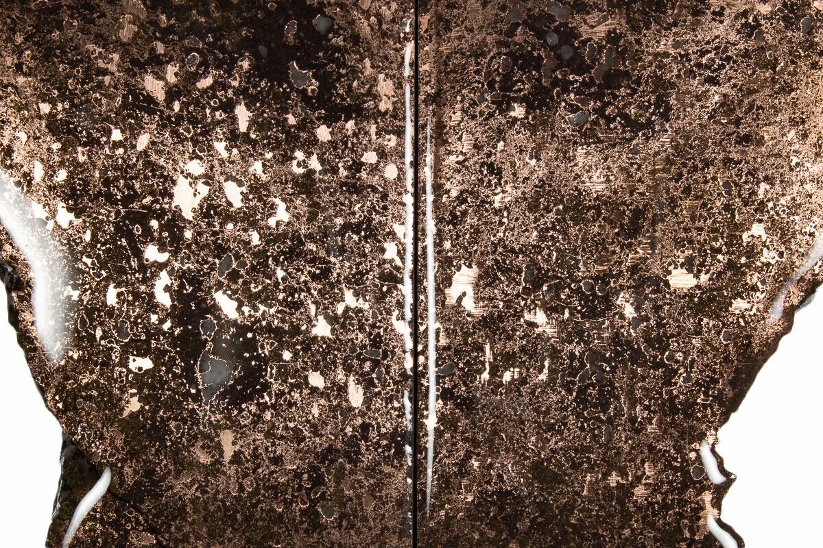 These bookends feature the natural host rock with veins of native copper running through them. They have been cut flat on two faces, coated in a clear epoxy and the bottom edge has been lined with cork. Each bookend slightly varies in size, with one measuring 6.9" tall, 3.5" wide, and 1.5" thick, while the other is 6.4" tall, 3.2" wide, and 1.5" thick.