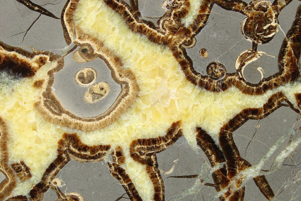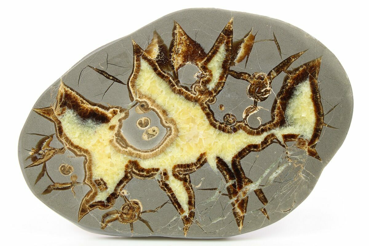 This is a beautiful polished slice from a septarian nodule, with several embedded marine shellfish fossils. This septarian was mined West of Orderville, Utah and was deposited during the Late Cretaceous, about 100 million years ago. The contrast between the grey limestone, yellow calcite crystals, and brown aragonite is quite stunning. It has been polished on one side and displays well on the included display stand.
