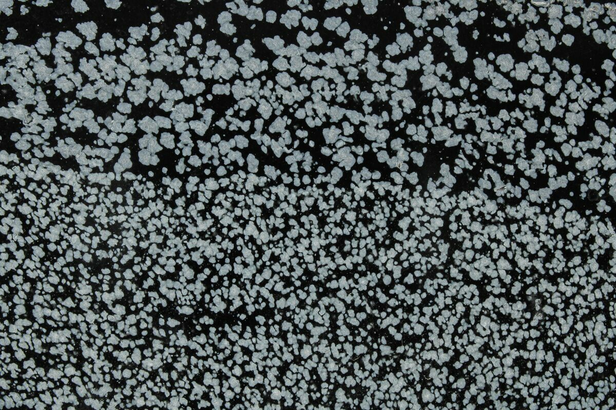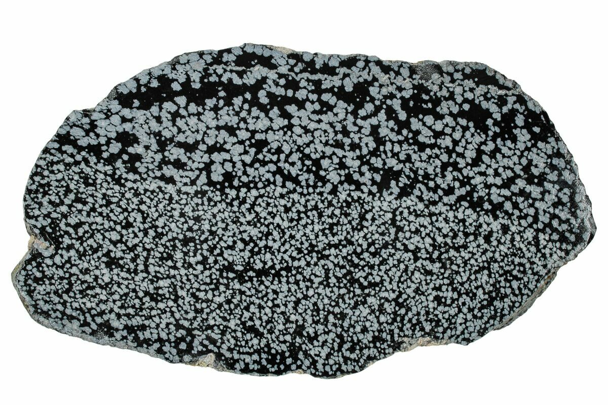 Unlike most of the material that comes from the famous location near Sevier Lake in Millard County, Utah, this snowflake obsidian is found at Obsidian Cliff in Wyoming. It is a natural volcanic "glass" that forms when molten rock cools so quickly that that atoms do not have enough time to arrange themselves into crystals. Instead, the molten material solidifies into an amorphous solid called a glass. The "snowflakes" in the obsidian are small, white, radially clustered crystals of cristobalite, a mineral polymorph of silica.