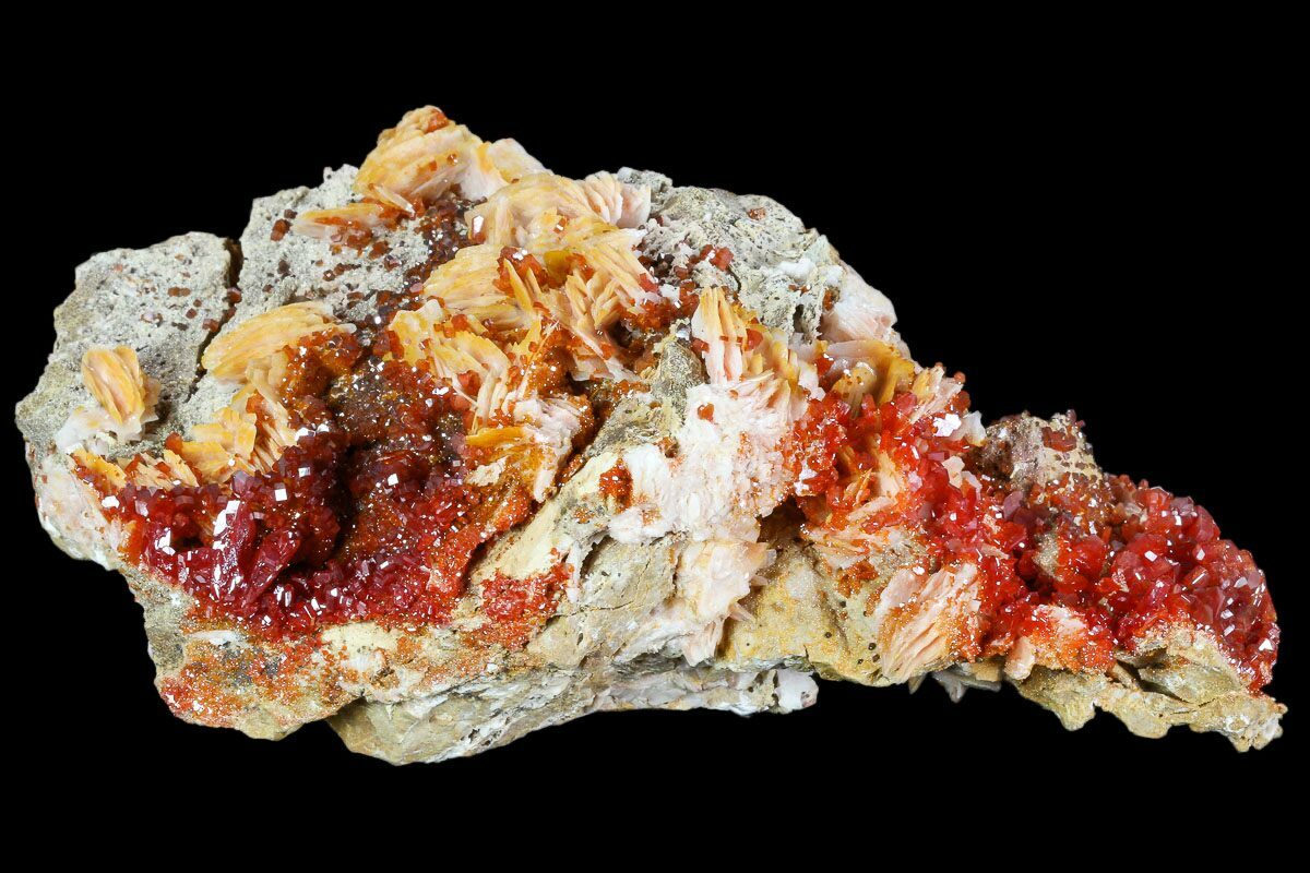 Vanadinite from Morocco is world-famous for producing some of the finest red crystal specimens on the planet. In the arid hills surrounding Mibladen and Taouz, vanadinite forms as vibrant clusters of hexagonal prisms, often with a deep crimson to orange-red color that seems to glow against the pale desert matrix. These crystals typically develop in dense groups, coating barite blades or covering weathered limestone with dazzling, glassy faces and sharp geometric symmetry. The dryness of the region and the slow oxidation of ancient lead deposits create the perfect geochemical environment for vanadinite to grow with exceptional clarity, luster, and intensity of color. Moroccan vanadinite is highly prized by collectors for its bold aesthetics, architectural crystal formations, and the consistent quality that has made these localities the global benchmark for the species.
