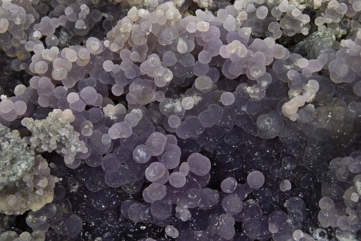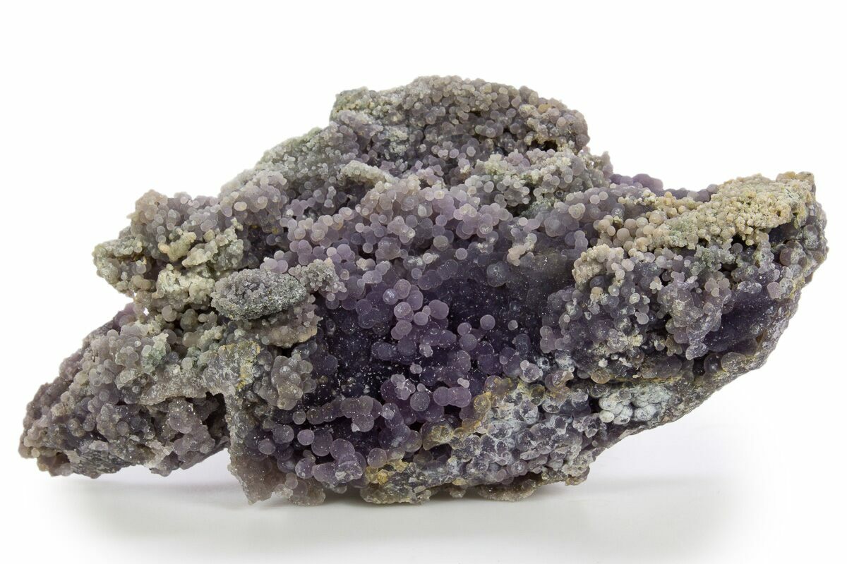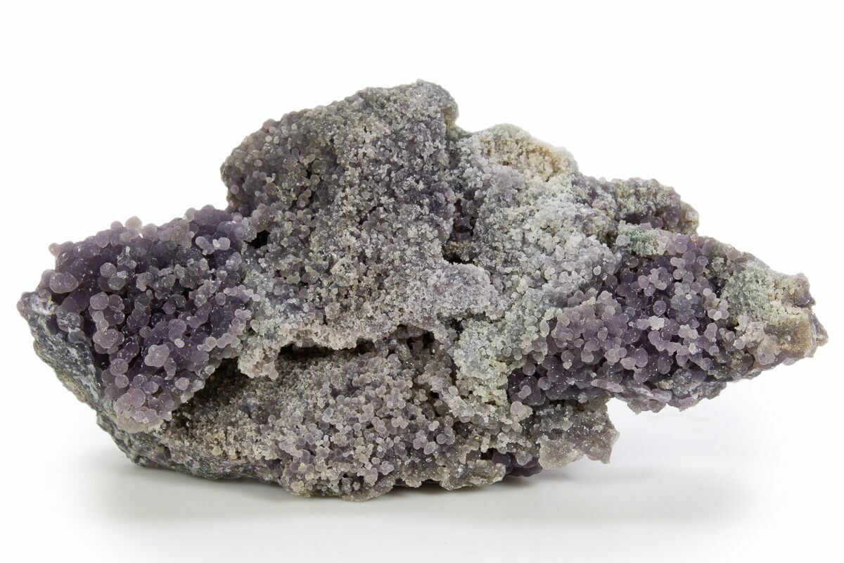 These formations were created over millions of years as silica-rich fluids filled voids and crevices in volcanic rock. As the fluids cooled, they precipitated tiny quartz crystals, which slowly grew in layers to create the nodules we see today. Its mineral composition and appearance set it apart from traditional agates, and it would be most technically correct to call it a "amethystine botryoidal chalcedony". As a collectible mineral, it’s relatively durable but should be kept out of direct sunlight to prevent color fading.